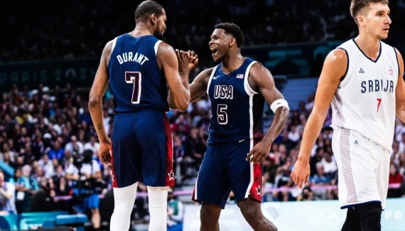 Et Kevin Durant ne s’arrête pas en si bon chemin. Contestés ou pas, les paniers de l’ailier des Suns tombent tous dedans. Nikola Jokic joue des coudes et de sa technique près du cercle et alors que Bogdan Bogdanovic met enfin un 3-points (qu’il célèbre d’un point rageur), la Serbie reste dans le match.