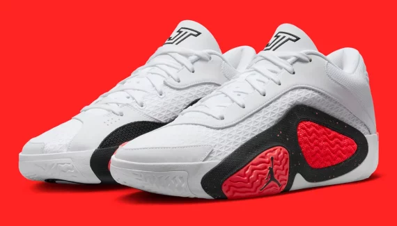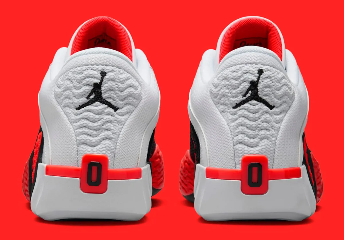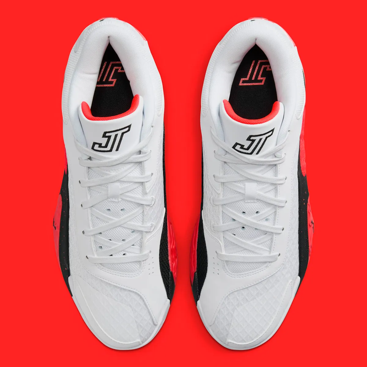 Parmi les prochains coloris à venir, on devrait retrouver cette version “Infrared, un classique chez Jordan Brand qui avait notamment utilisé ce code couleur pour habiller la Luka 2 en début de saison dernière. Cette JT 2 offre une tige dotée d’une partie supérieure en blanc assortie de renforts latéraux en rouge entouré de noir. Le logo du joueur sur la languette, le “Jumpman” ainsi que son numéro zéro sur le talon ressortent en noir.