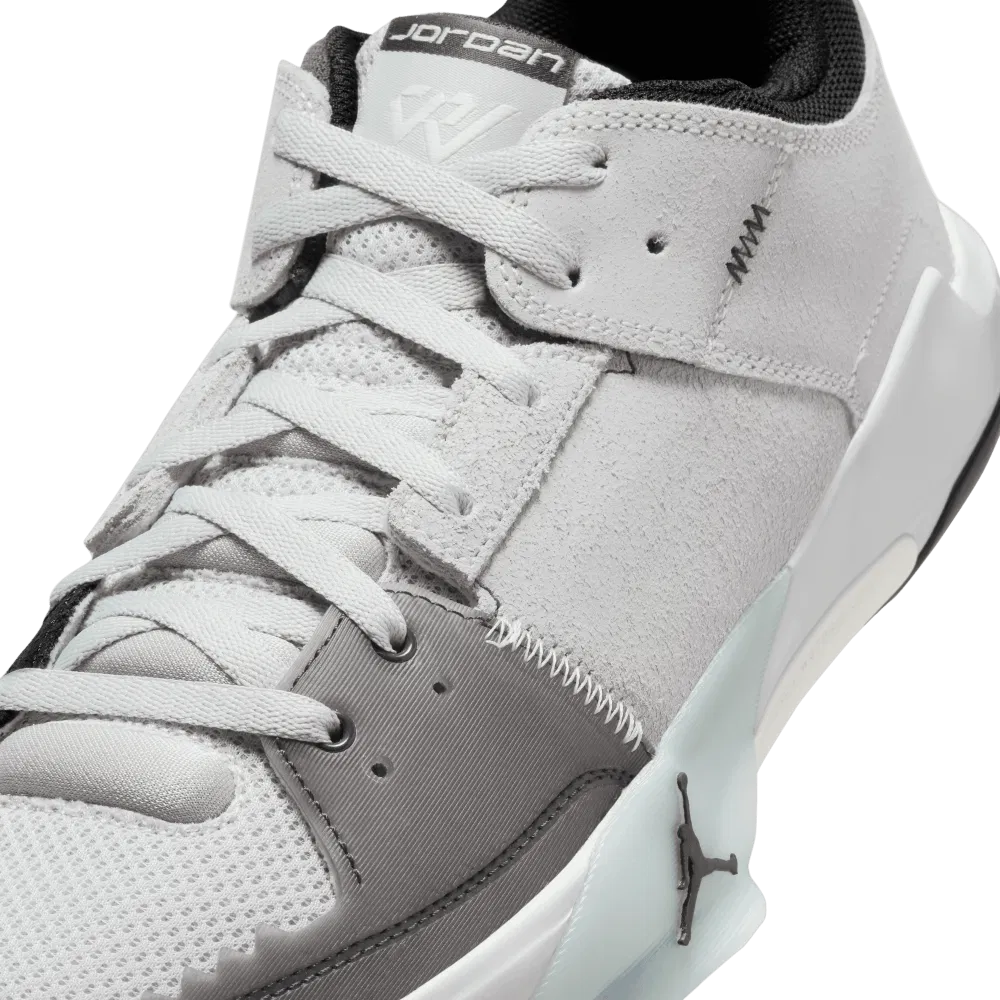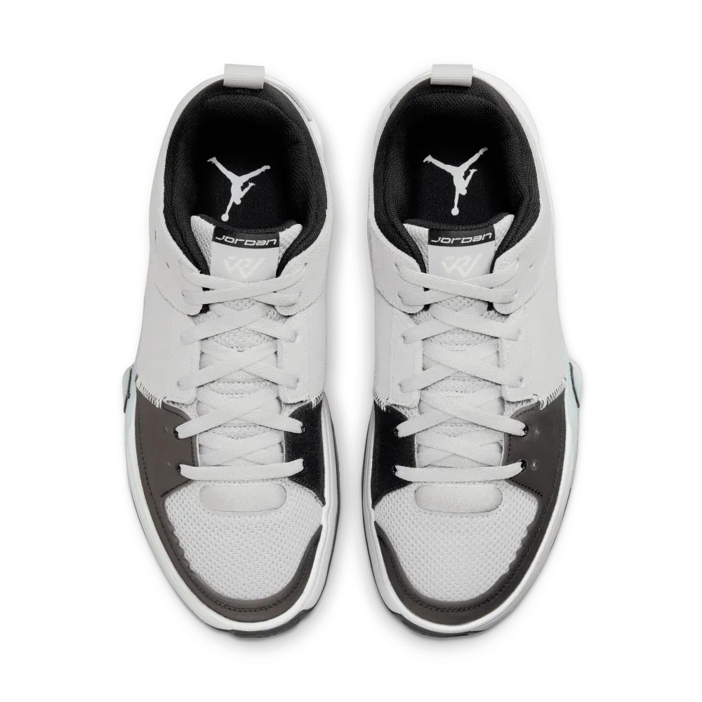 Pour Russell Westbrook, la ville lumière lui inspire aussi sa passion pour la mode, et c’est en ce sens que ce modèle, plus abordable au niveau du prix, a été spécialement travaillé. On retrouve aussi du “daim poilu” sur une partie de l’empeigne en blanc-gris, complété par du mesh notamment, avec des touches de gris à l’avant de la chaussure gauche et de noir sur la droite, ainsi qu’au talon. Le logo “RW” du joueur apparaît en blanc sur la languette et le talon. Un “Jumpman” noir repose sur la partie translucide en bleu clair de la semelle extérieure.