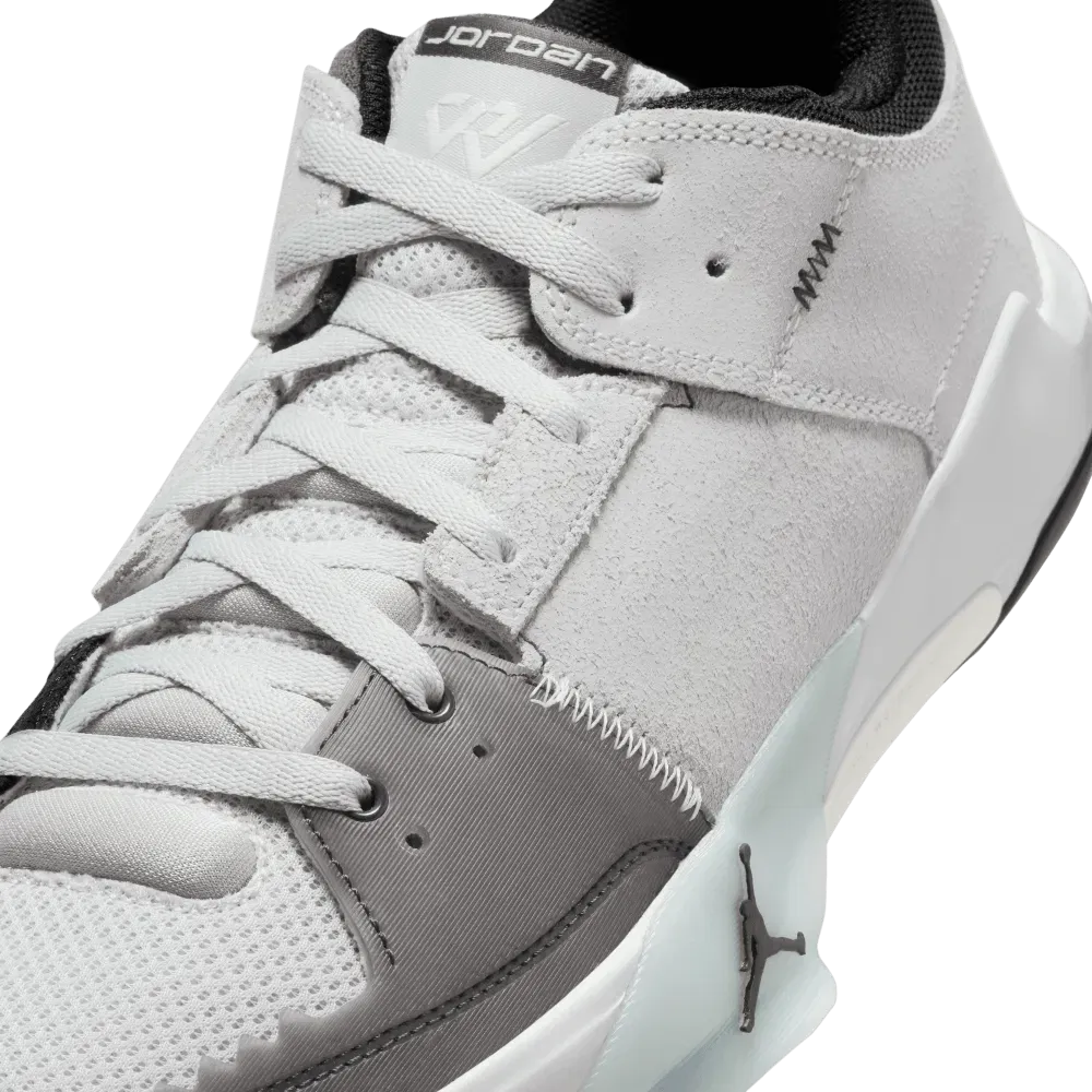 Pour Russell Westbrook, la ville lumière lui inspire aussi sa passion pour la mode, et c'est en ce sens que ce modèle, plus abordable au niveau du prix, a été spécialement travaillé. On retrouve aussi du “daim poilu” sur une partie de l'empeigne en blanc-gris, complété par du mesh notamment, avec des touches de gris à l'avant de la chaussure gauche et de noir sur la droite, ainsi qu'au talon. Le logo “RW” du joueur apparaît en blanc sur la languette et le talon. Un “Jumpman” noir repose sur la partie translucide en bleu clair de la semelle extérieure.