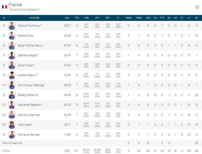Marine Johannès débute le deuxième quart-temps par un airball et on commence à s’inquiéter, alors que les deux premières rencontres de la journée ont été marquées par les victoires surprises du Nigeria et de l’Allemagne, respectivement face à l’Australie et la Belgique. Mais Alexia Chery débloque enfin le compteur des Bleues à 3-points (après un 0/6 pour débuter) et la France reprend le contrôle des opérations. Temps-mort pour le Canada.