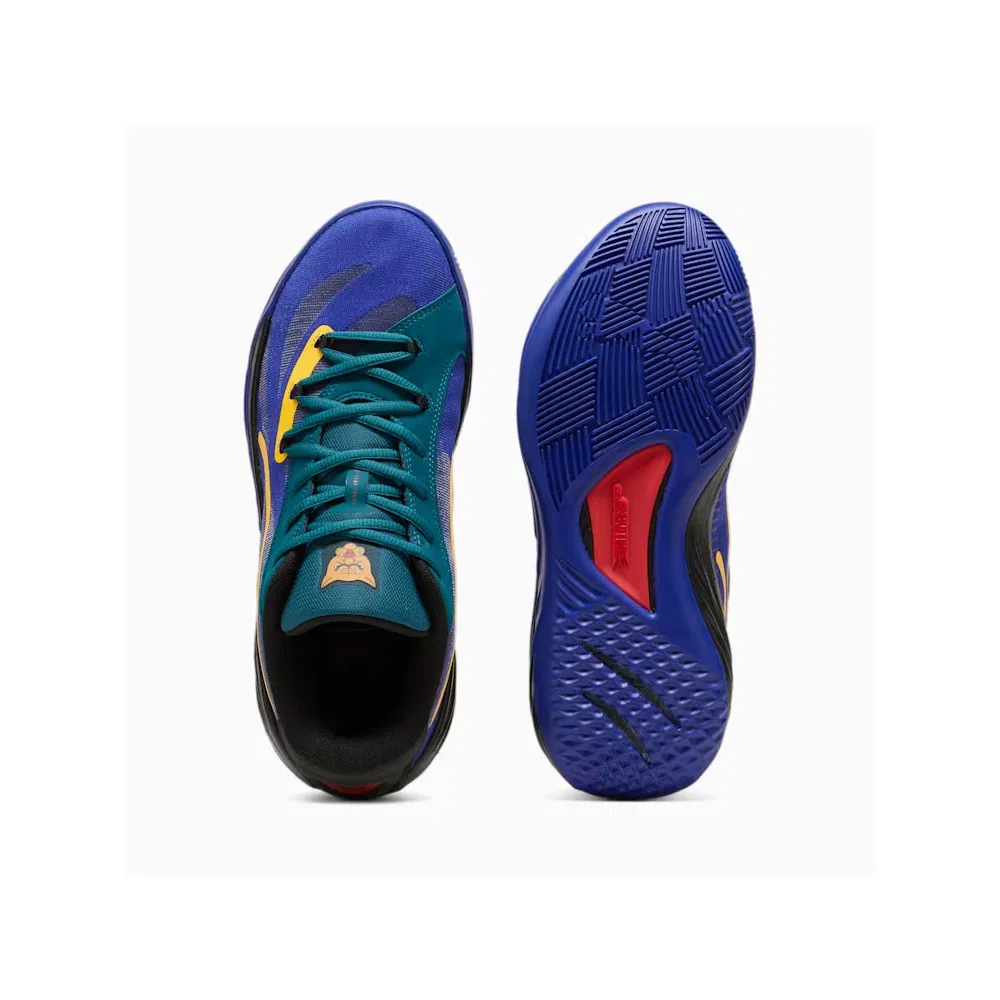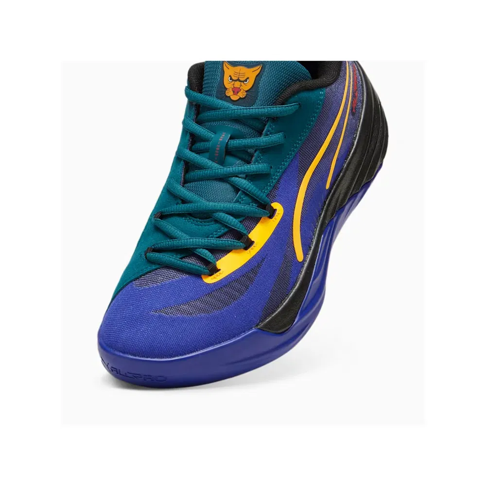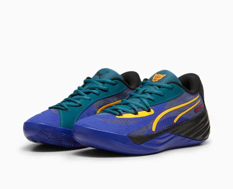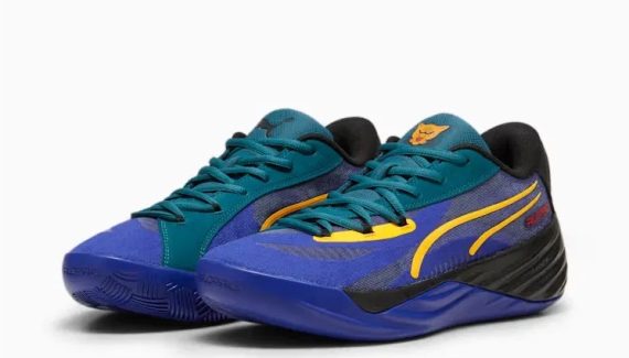 Voici le 19e, baptisé « Crowd Craze Black » et doté d’une tige en noir et bleu marine contrastée par des bandes « PWR Tape » jaunes parcourant l’empeigne. La languette et apparaît en vert turquoise tandis que d’autres finitions sont présentes en rouge, comme l’inscription « All-Pro » et le logo Puma sur le talon.