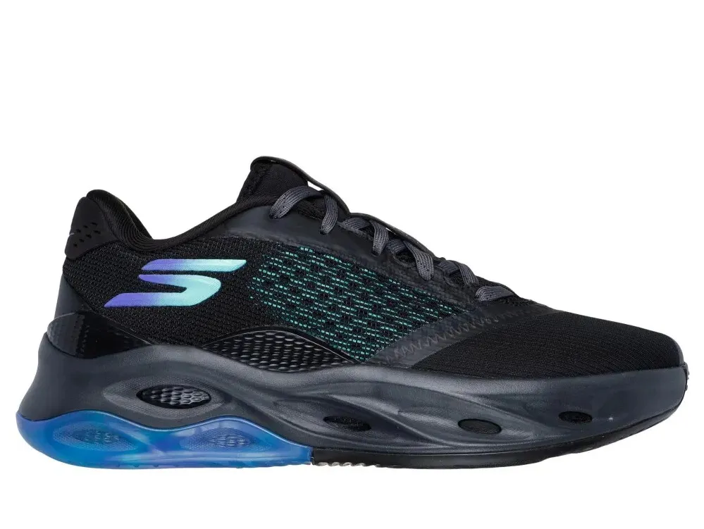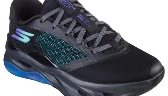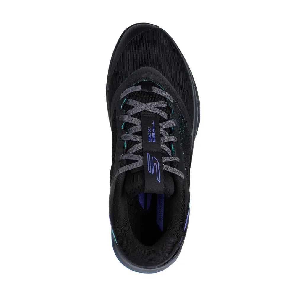 Le modèle opte ici pour un coloris noir avec une superpositions de couches pour composer la tige dont du mesh respirant sur l'empeigne, avec de légers renforts latéraux en TPU pour compléter le maintien du pied. Le logo S de Sketchers ressort dans un dégradé allant du violet au bleu ciel. Le « SKS BBALL » apparaît de son côté en violet sur l'étiquette recouvrant les lacets.