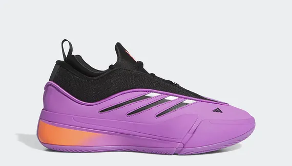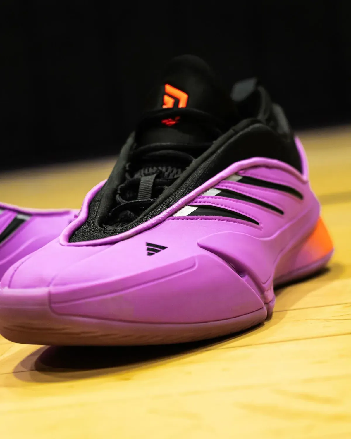 Pour ce premier coloris « Purple Burst » se décline par une base en mesh noir ressortant sur la partie supérieure, assortie d'une superposition synthétique violette. La semelle offre pour sa part un dégradé allant du violet à l'orange. On retrouve également le logo du joueur en orange sur la languette tandis que les trois bandes de la marque adidas apparaissent en noir sur l'empeigne.
