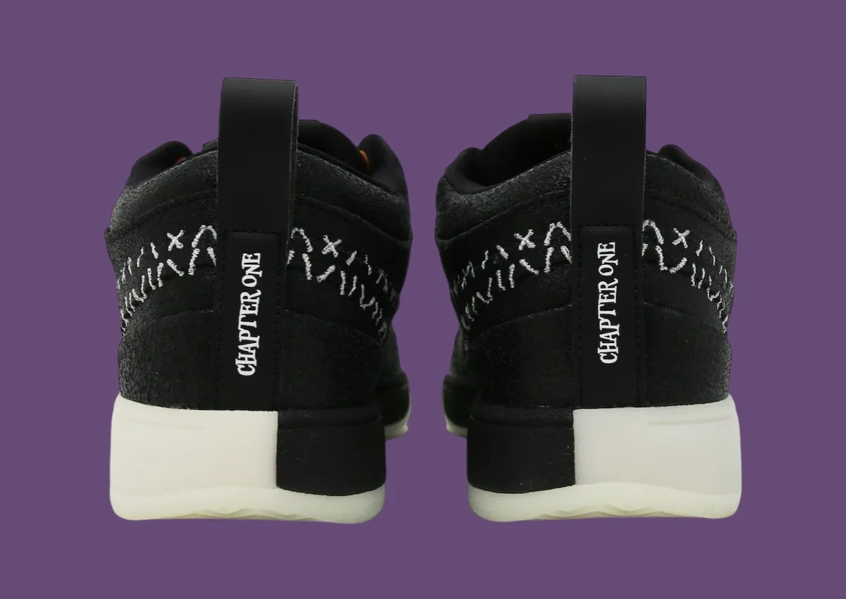 La tige en noir oscille entre cuir et nubuck, avec sur l'empeigne un « Swoosh » dont les contours apparaissent en blanc dans un style similaire à une ensemble de points de suture. On retrouve le même esprit de « cicatrice » en orange sur la languette pour accompagner le logo « Book », également en orange. L'inscription « Chapter One » présente en vertical sur le talon apparaît avec une police toute particulière pour l'occasion. L'ensemble repose sur une semelle en noir et blanc.