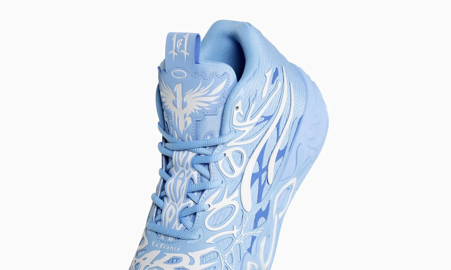 La MB.03 a été l'une des meilleures paires distribuées sur le marché la saison dernière sur le plan de la performance, tout en poursuivant sa ligne directrice en terme de style avec des modèles toujours plus “flashy” et originaux. Hier, ce fut au tour de la MB.04 d'être officiellement présentée par Puma, un modèle sur lequel on retrouve le même ADN que sur les chaussures précédentes, avec toujours plus de motifs et de détails pour habiller la tige en mesh, entre les habituels logos et ornements présents sur la languette notamment comme le Phoenix, le “1 of 1”, et de nouvelles inscriptions pour accompagner notamment le “RARE” ici présent à la base des lacets.