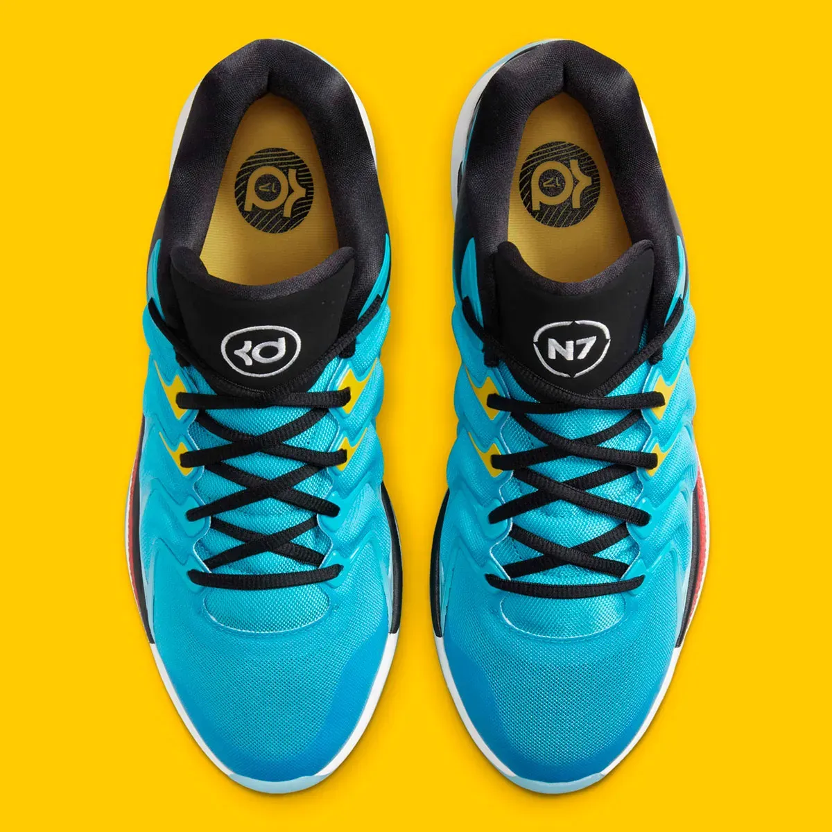 Douze ans plus tard, c'est donc tout naturellement que la KD 17, 17e chaussure signature de Kevin Durant, fait son retour dans la gamme N7 avec ce coloris principalement bleu turquoise et noir. La tige prend un petit côté drapeau des Bahamas avec ses touches de jaunes sur quatre de ses dix œillets. Le logo N7 figure en blanc sur noir sur la languette de la chaussure gauche avec également un motif inédit au niveau du talon.