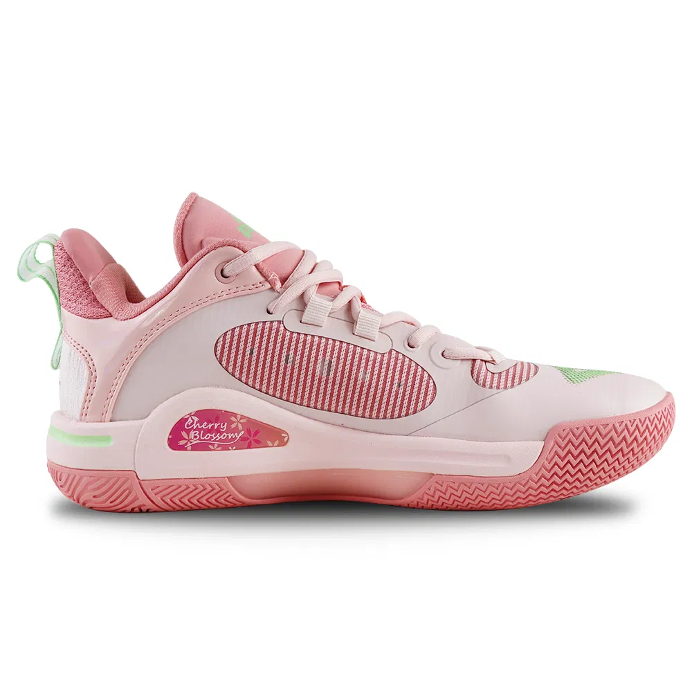 Deux premiers coloris avaient été distribués à l’occasion de sa sortie. En voici un troisième, baptisé « Cherry Blossom » (fleur de cerisier), recouvrant la tige en plusieurs teintes de rose. Des finitions en vert pâle font ressortir les logos Peak, la tirette et la bande en TPU présente à l’extérieur de la semelle intermédiaire, où figure également l’inscription « Cherry Blossom » en rose.