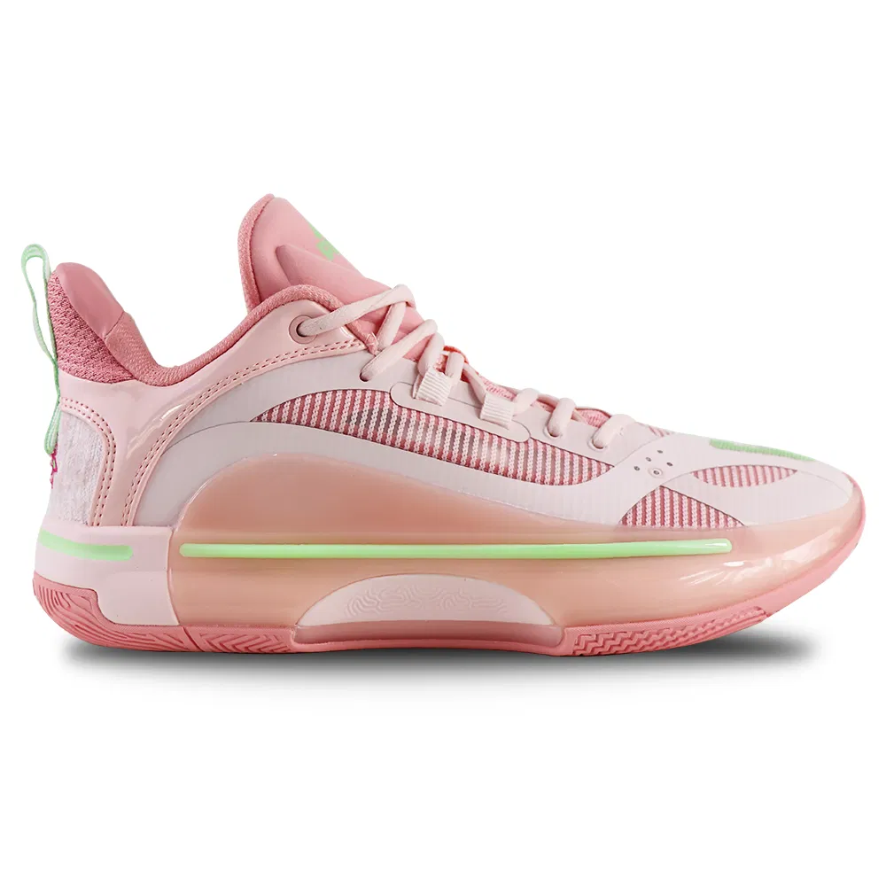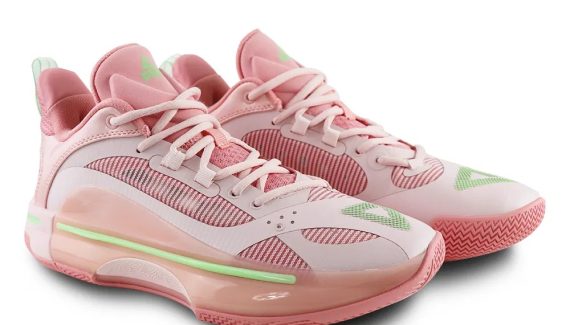 Deux premiers coloris avaient été distribués à l’occasion de sa sortie. En voici un troisième, baptisé « Cherry Blossom » (fleur de cerisier), recouvrant la tige en plusieurs teintes de rose. Des finitions en vert pâle font ressortir les logos Peak, la tirette et la bande en TPU présente à l’extérieur de la semelle intermédiaire, où figure également l’inscription « Cherry Blossom » en rose.