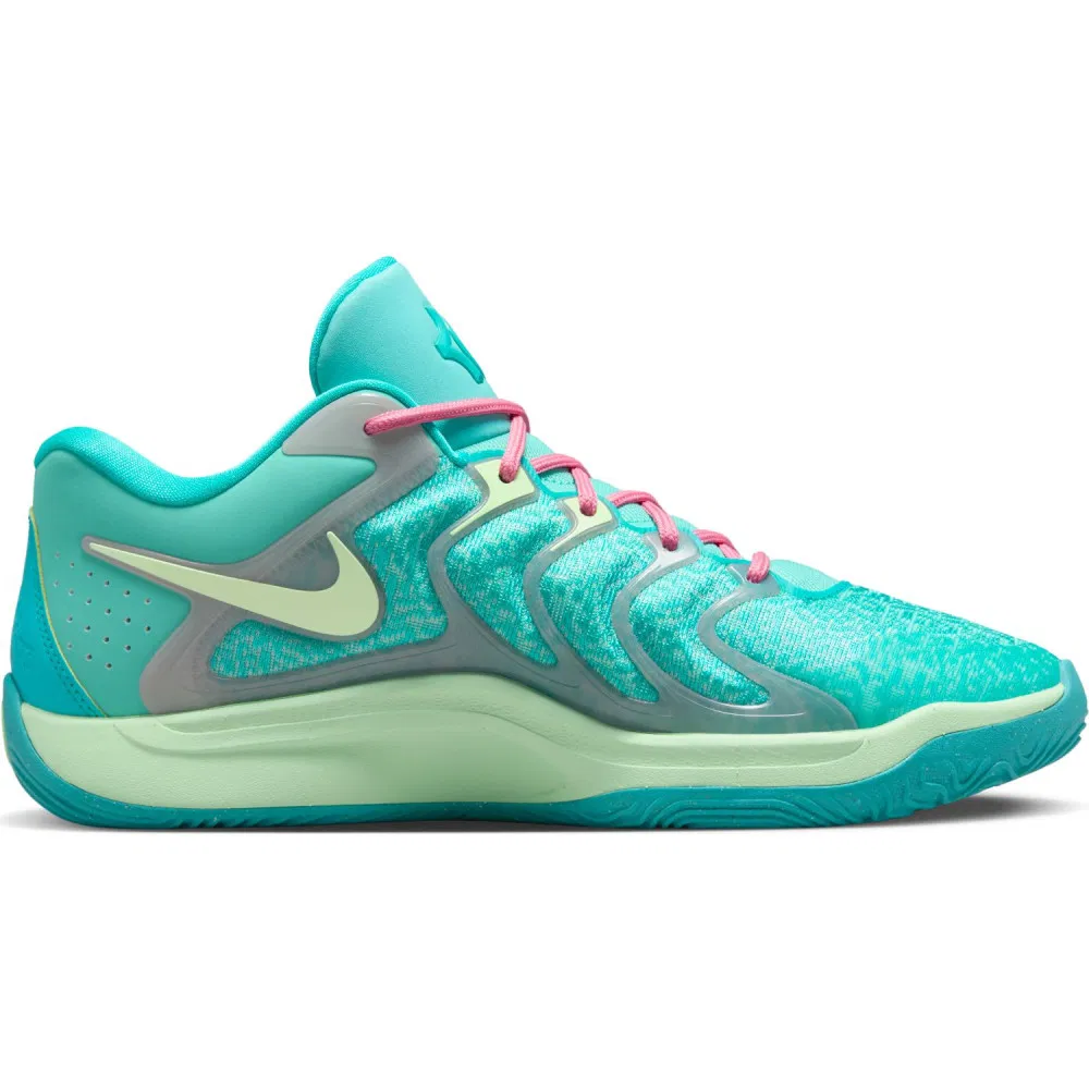On retrouve deux teintes de bleu turquoise pour illustrer les Bahamas avec des renforts latéraux qui apparaissent en gris. L’ensemble est accompagné d’un vert pâle qui ressort notamment sur le « Swoosh » et la semelle intermédiaire, tandis que les lacets rose viennent contraster le tout.