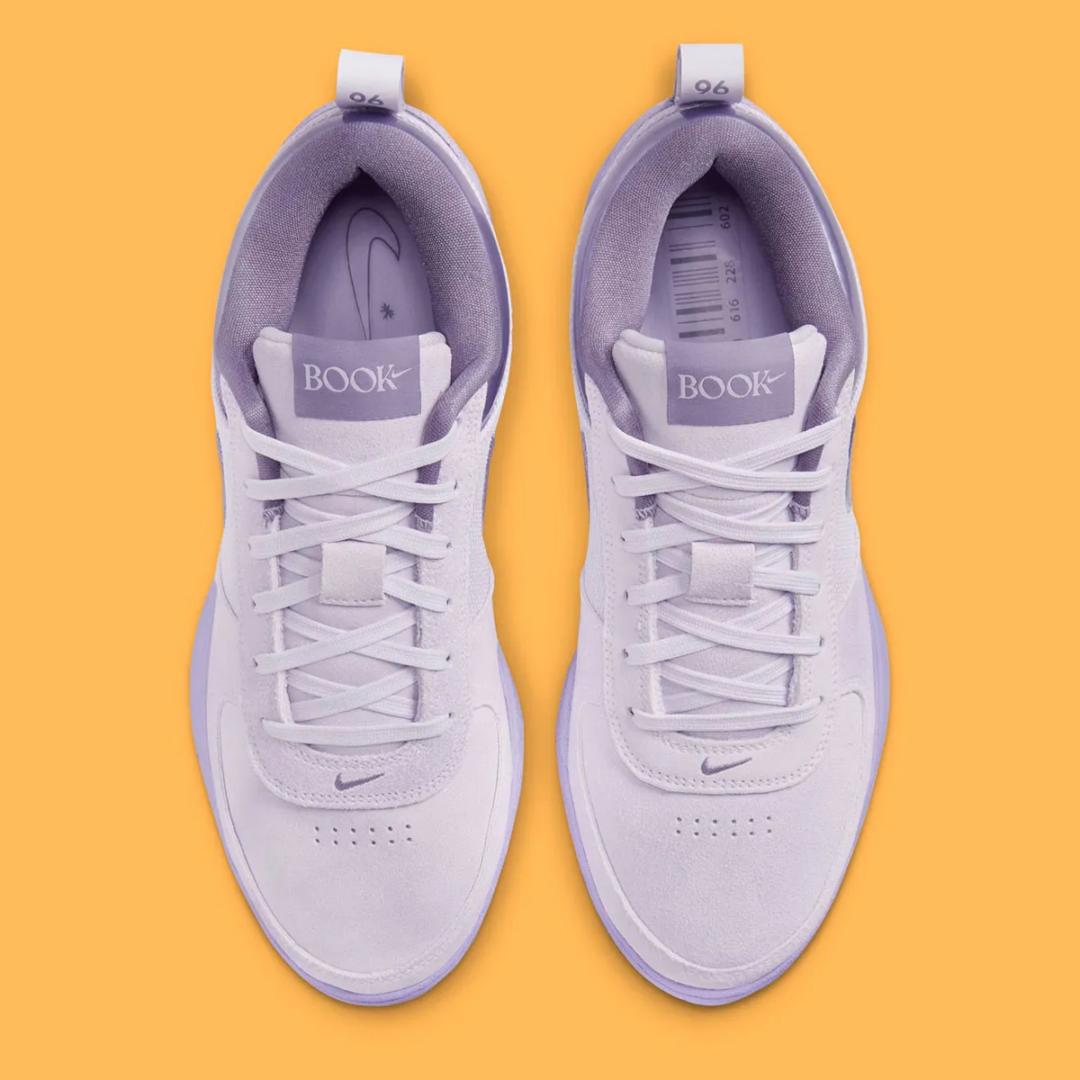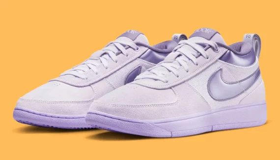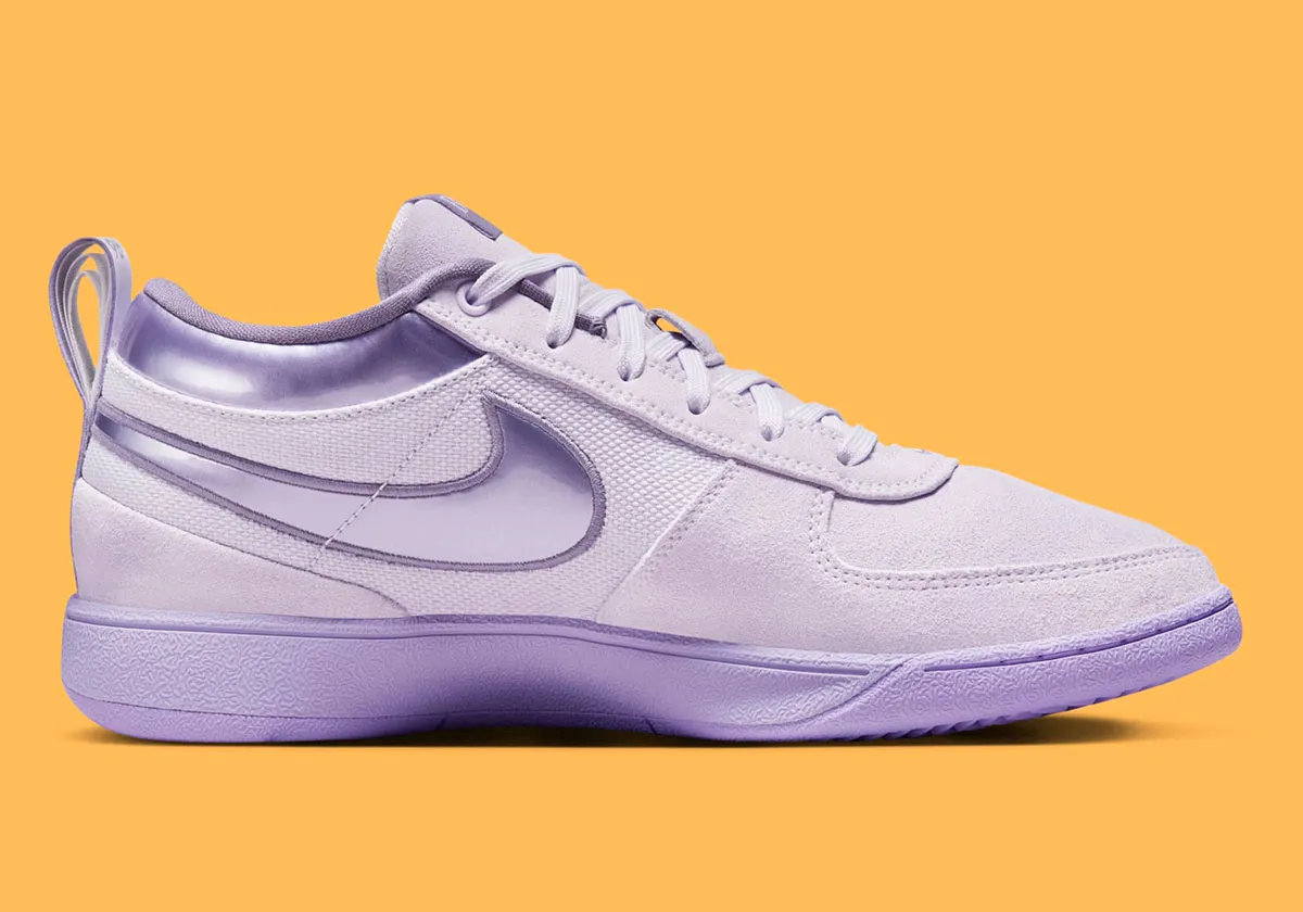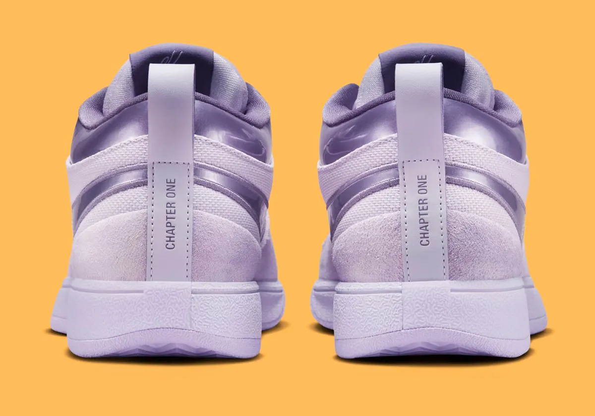 Un violet pastel orne la tige composée de mesh, de cuir et d’une partie en daim à l’avant. Le « Swoosh » et le col apparaissent dans un violet plus foncé, de la même couleur que celui utilisé pour la semelle. Les inscriptions sur la languette ressortent également en violet sur la languette et la tirette.