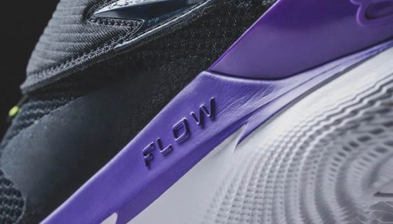 On dispose désormais de premiers clichés qui permettent d’en savoir plus sur ce à quoi ressemblera la fameuse “Curry Fox 1”. On commence par le logo du meneur des Kings qui va prendre la forme d’une silhouette… de renard (“fox” en anglais) formant la lettre D. Au niveau design de la tige, ressortant ici entre noir, violet et vert fluo “Volt”, on peu voir qu’une sangle va parcourir le milieu du pied et recouvrir les lacets.