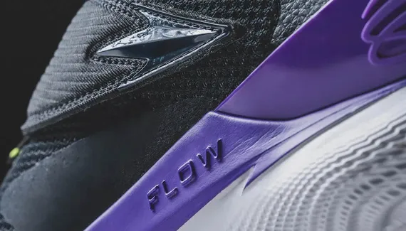 On dispose désormais de premiers clichés qui permettent d'en savoir plus sur ce à quoi ressemblera la fameuse “Curry Fox 1”. On commence par le logo du meneur des Kings qui va prendre la forme d'une silhouette… de renard (“fox” en anglais) formant la lettre D. Au niveau design de la tige, ressortant ici entre noir, violet et vert fluo “Volt”, on peu voir qu'une sangle va parcourir le milieu du pied et recouvrir les lacets.