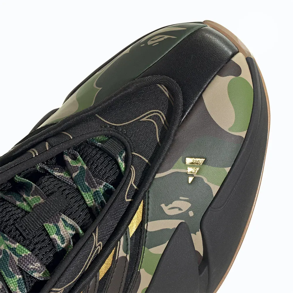 On retrouve ainsi deux tiges particulièrement travaillées, tant sur leur composition qu'au niveau des motifs présents. Le coloris « Core Black » ressort en noir assorti de vert kaki et de finitions en doré comme l'inscription et le logo « Bape » au niveau du talon, avec une semelle noir et marron.