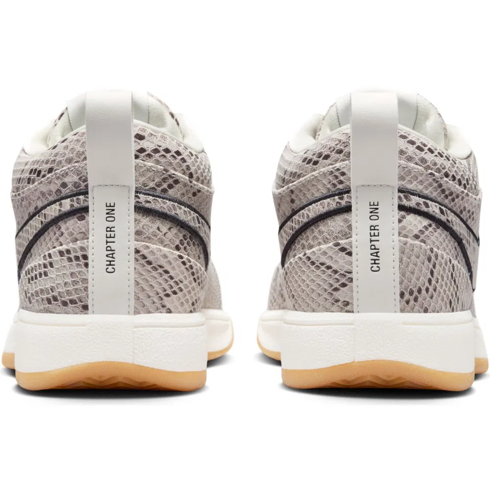Cette fois, c’est un coloris « Python » qui vient de débarquer, avec un imprimé entre blanc noir et gris recouvrant l’ensemble de la tige. Le contour du logo « Nike » ressort en noir, tandis que la semelle ressort en blanc et beige. Les inscriptions « Book » et « Chapter One » sont toujours présentes sur la languette et au niveau du talon.