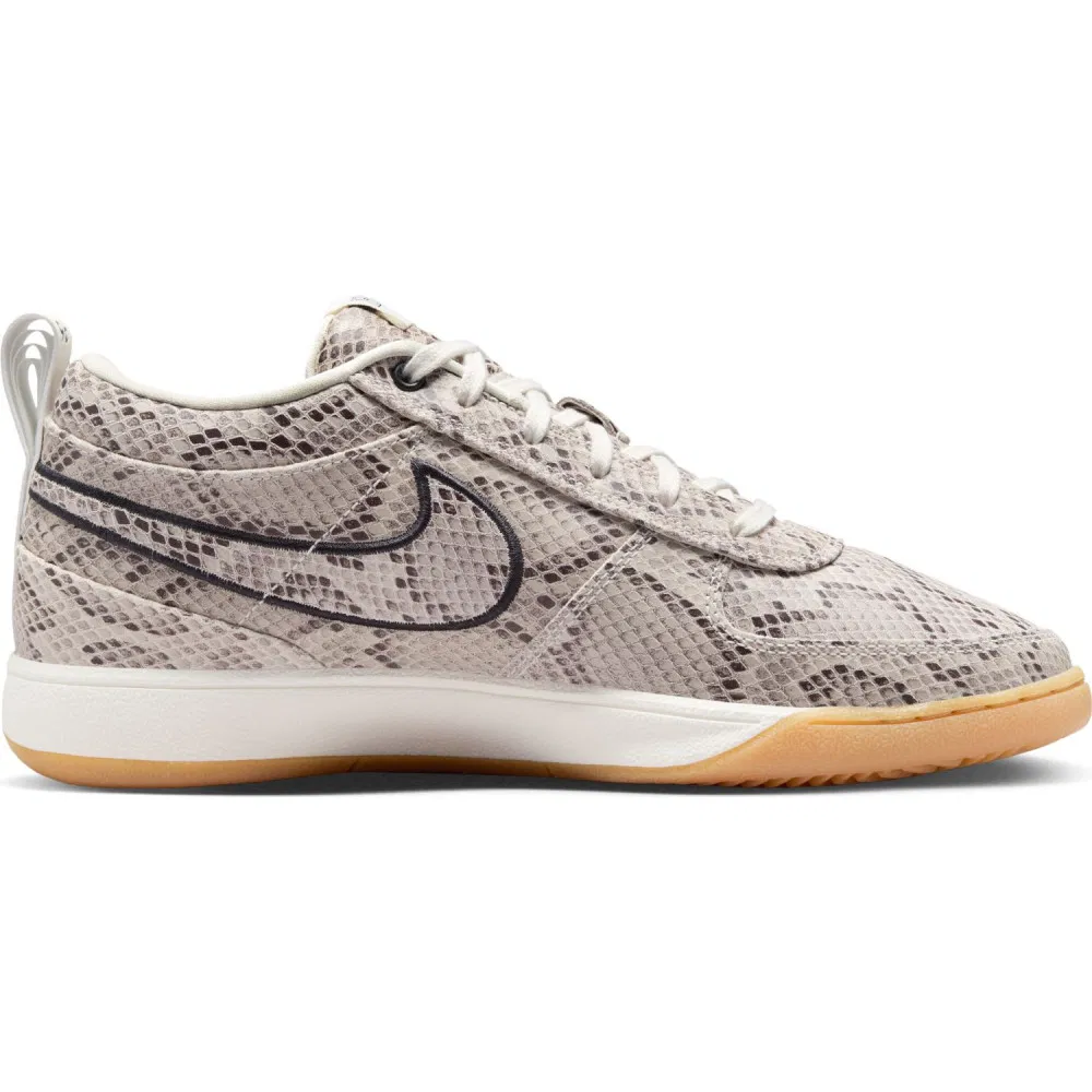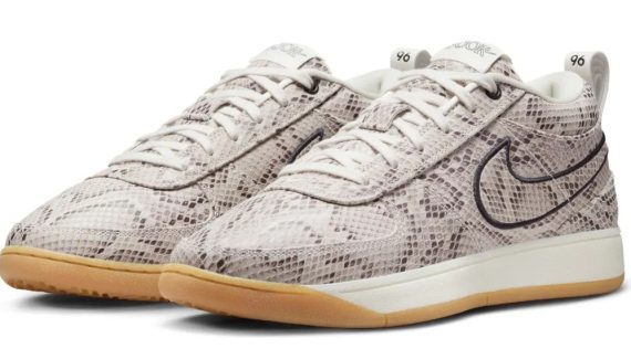 Cette fois, c’est un coloris « Python » qui vient de débarquer, avec un imprimé entre blanc noir et gris recouvrant l’ensemble de la tige. Le contour du logo « Nike » ressort en noir, tandis que la semelle ressort en blanc et beige. Les inscriptions « Book » et « Chapter One » sont toujours présentes sur la languette et au niveau du talon.