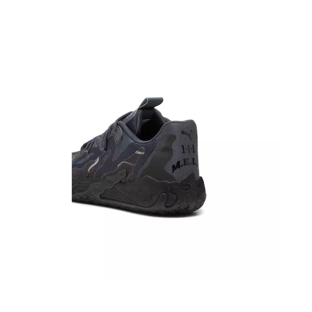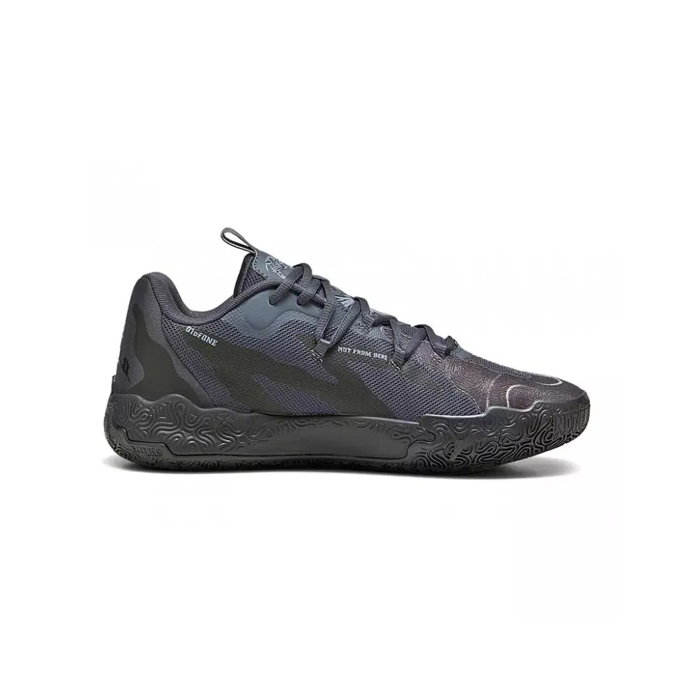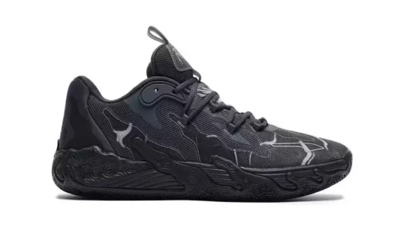 Comme son nom l’indique, le modèle est principalement orné de noir avec des finitions en gris, pour faire ressortir les logos, les inscriptions ainsi que les différents motifs présents sur la tige. Après avoir sorti un modèle «White Grey » puis « Lava », Puma espère donc boucler la boucle avec ses versions basses en mettant en vente la MB.03 Low « Team Black ».