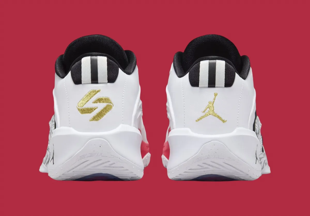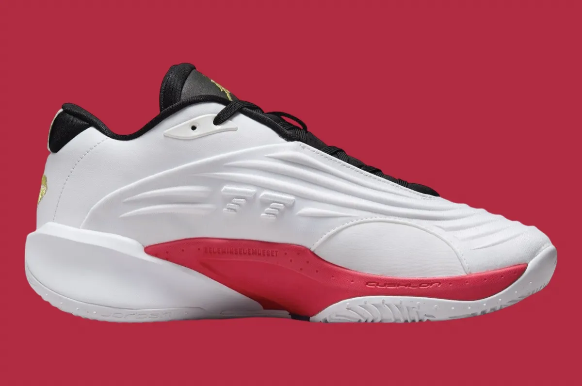 Cette version de la troisième chaussure signature de Luca Doncic se présente avec une tige blanche, une languette noire sur laquelle le logo du joueur et le « Jumpman » ressortent en doré. La touche « White Cement » apparaît au niveau de la semelle intermédiaire et de la base de l’empeigne. On note enfin une touche de rouge sur la semelle intermédiaire pour compléter l’ensemble reposant sur une semelle extérieure blanche.