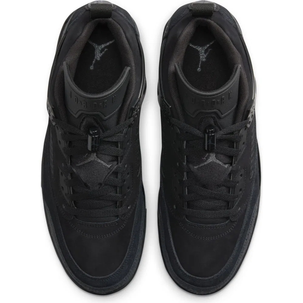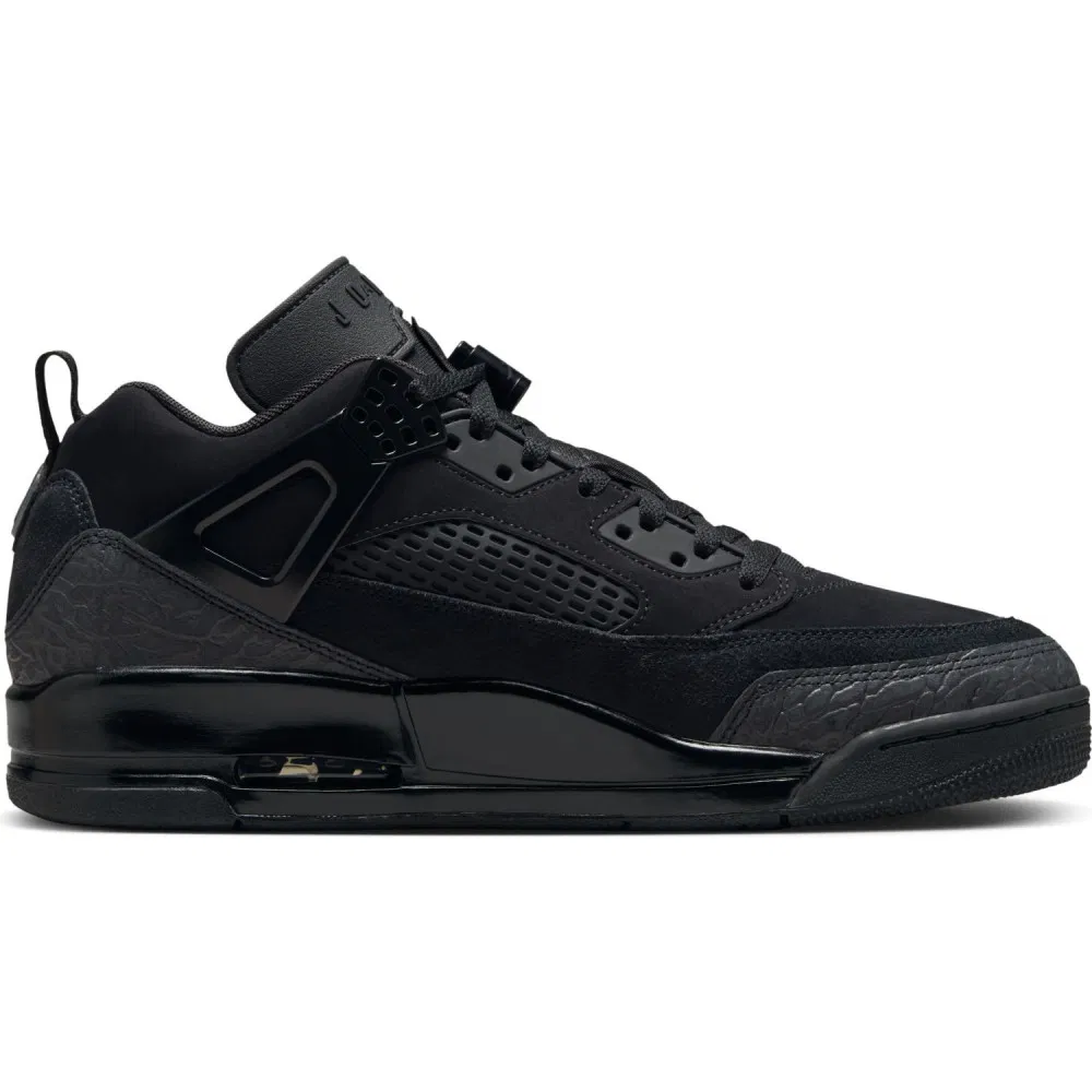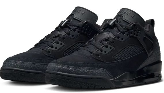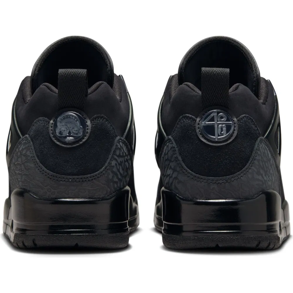 La marque au Jumpman fait actuellement renaître la Jordan Spizike avec une multitude de coloris dont cette version Low baptisée « Black Cat ». Le modèle entièrement noir multiplie les matériaux différents et les clins d’œil à ses quatre sources d'inspiration. L'imprimé éléphant tiré de la Air Jordan III apparaît pour sa part en gris sur la base arrière.