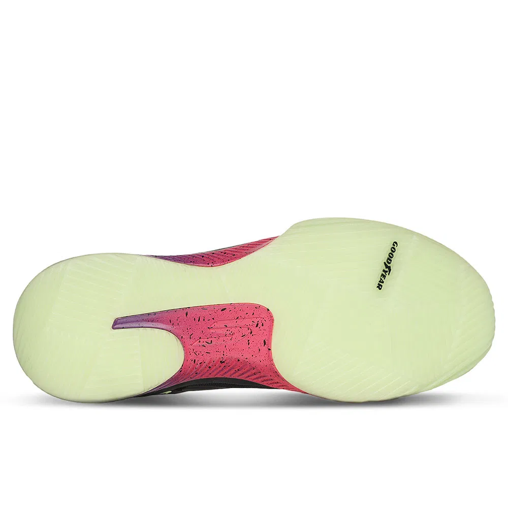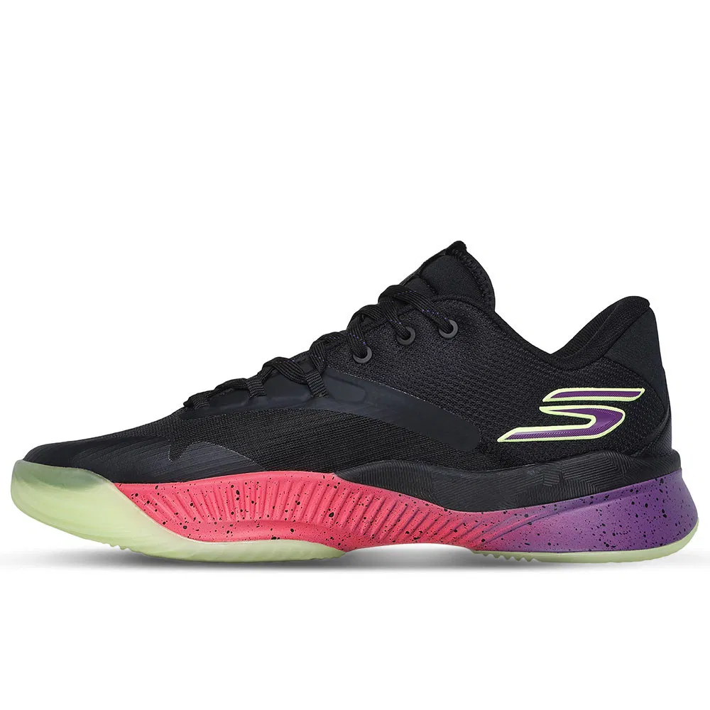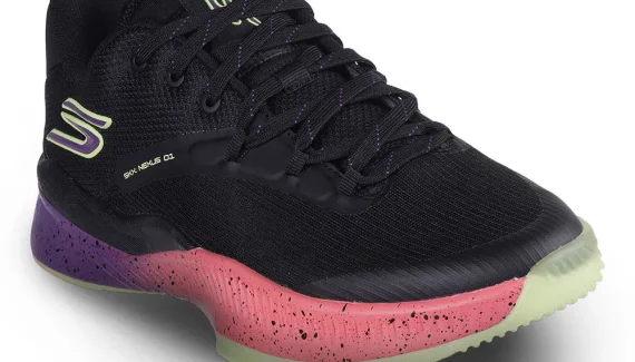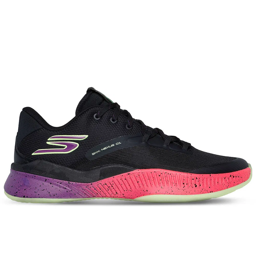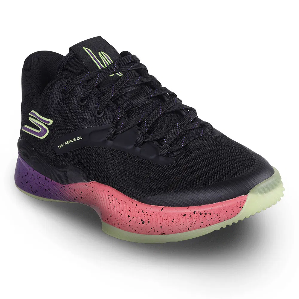 Il s’agit de la SKX Nexus, un modèle conçu pour bonifier vitesse, stabilité et soutien. La chaussure présente une tige basse, ici en noir, tandis que la semelle intermédiaire ressort dans un dégradé allant du violet au orange-saumon. On soupçonne des touches phosphorescentes au niveau de la semelle extérieure et du logo présent sur la malléole.
