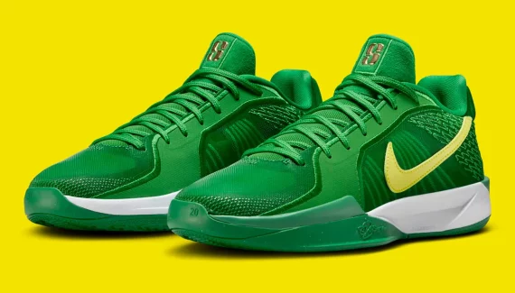 Comme c’était le cas l’an dernier pour la Sabrina 1, la Sabrina 2 bénéficie du dispositif « Nike By You » qui permet au grand public de personnaliser sa paire aux couleurs de son choix. Un atout qui n’empêche pas Nike de sortir ses propres coloris, dont cette version aux couleurs d’Oregon qui s’apprête à son retour sur la Sabrina 2.