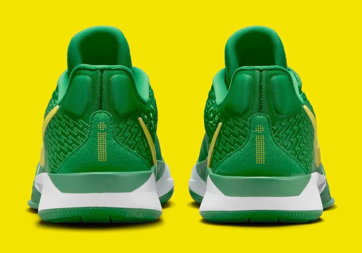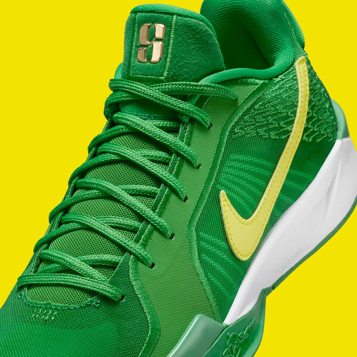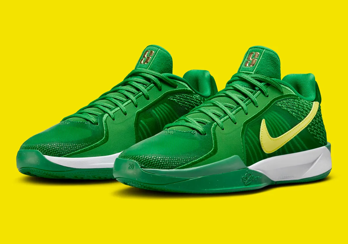 La tige est ornée de deux teintes de vert avec pour contraster le tout un « Swoosh » jaune sur l’empeigne et le logo « S » de la joueuse en doré sur la languette. L’ensemble correspond aux couleurs des Oregon Ducks, la fac de Sabrina Ionescu pendant quatre ans, de 2016 à 2020, avant d’intégrer la WNBA.