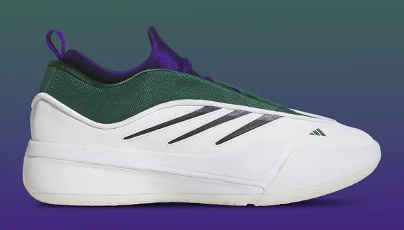 Pour accompagner la base de la tige en blanc, la 9e chaussure signature du meneur All-Star est habillée d'une partie supérieure en mesh vert foncé, tandis que le col et la languette ressortent en violet foncé. Les trois “griffes” présentes sur l'empeigne apparaissent en noir et violet.