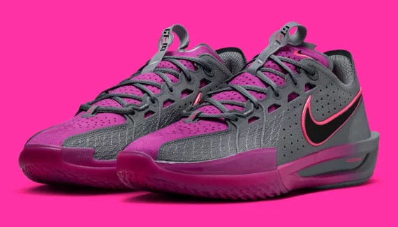 Le rose est toujours autant à la mode pour les paires de basket et cette Nike Zoom GT Cut 3 va à son tour en profiter en présentant ce nouveau coloris “Hot Fuchsia” pour le moins “flashy”. La tige attire effectivement l’oeil puisque les parois latérales en gris sont ici complétées par des touches “fuchsia”, entre le violet sur la languette et l’avant du pied et du rose vif pour orner le Swoosh présent sur l’empeigne et la languette.