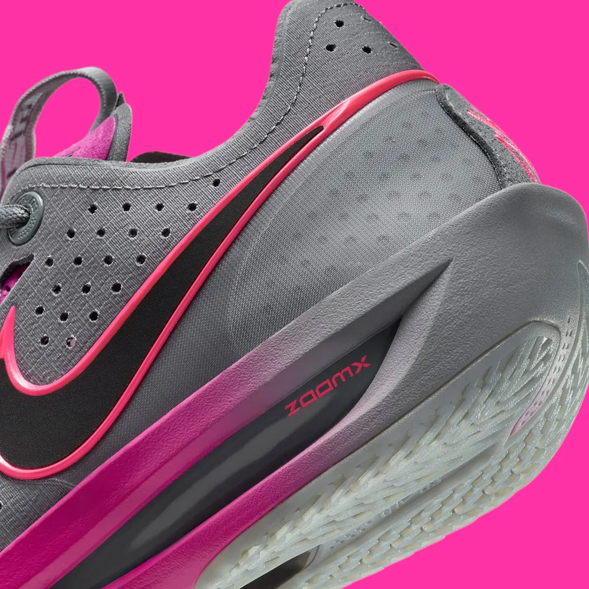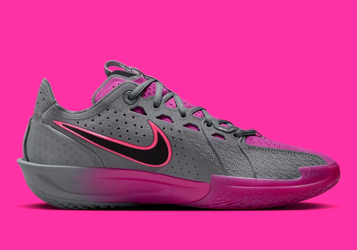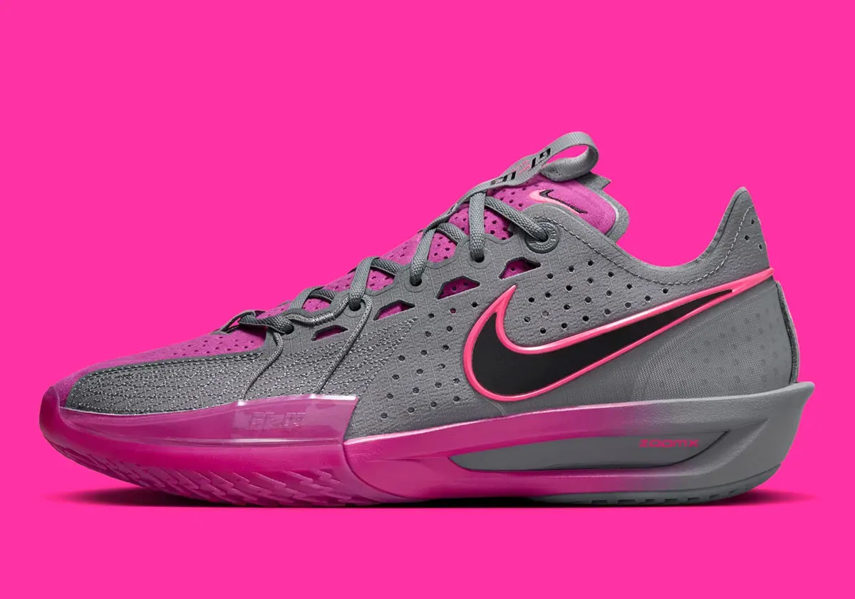 Le rose est toujours autant à la mode pour les paires de basket et cette Nike Zoom GT Cut 3 va à son tour en profiter en présentant ce nouveau coloris “Hot Fuchsia” pour le moins “flashy”. La tige attire effectivement l'oeil puisque les parois latérales en gris sont ici complétées par des touches “fuchsia”, entre le violet sur la languette et l'avant du pied et du rose vif pour orner le Swoosh présent sur l'empeigne et la languette.