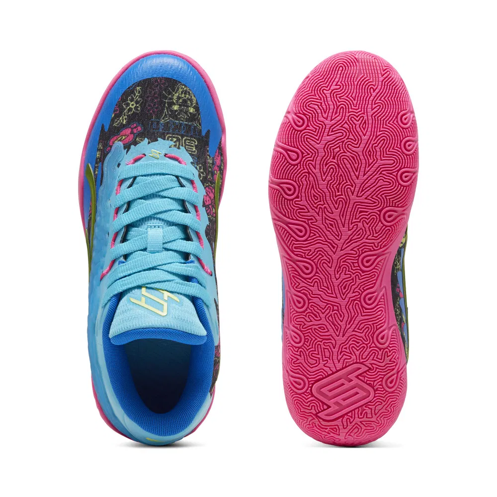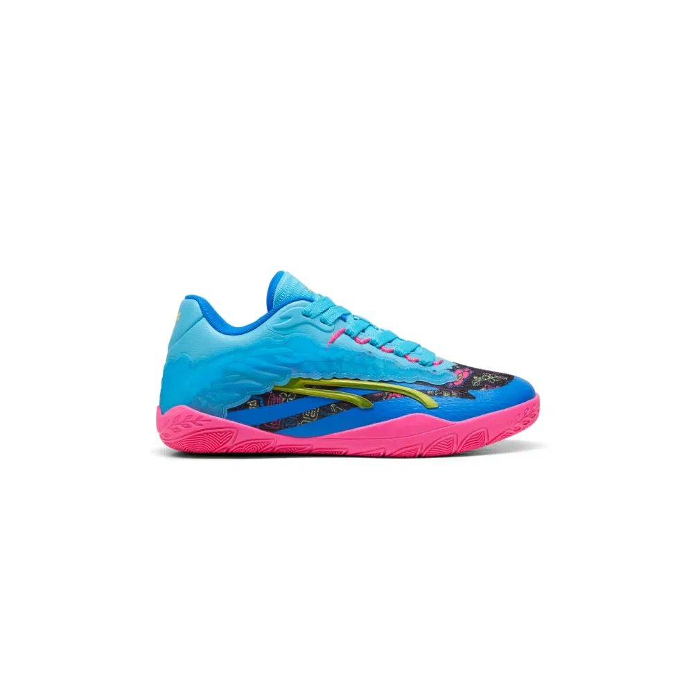 La tige arbore deux teintes de bleu, entre un bleu clair sur la partie supérieure, et plus foncé à la sa base. L’ensemble est complété par des motifs en noir, jaune et rose faisant référence aux nuits de Tokyo. Les finitions, comme le logo de la joueuse sur la languette ou le logo Puma sur le talon, ressortent également en jaune. Enfin, la semelle contraste le tout d’un rose éclatant.