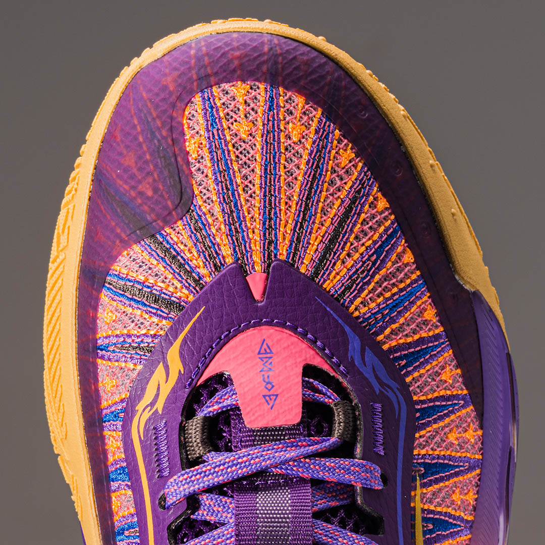 D’infimes touches de bleu, la couleur préférée de Drederick Irving, et de fuchsia, en hommage à la défunte mère de Kyrie, habillent également l’empeigne. Deux flammes sur les lacets complètent le symbole de cette union. Enfin, les parties dorées symbolisent la générosité et la compassion, des valeurs transmises à Kyrie par sa famille.