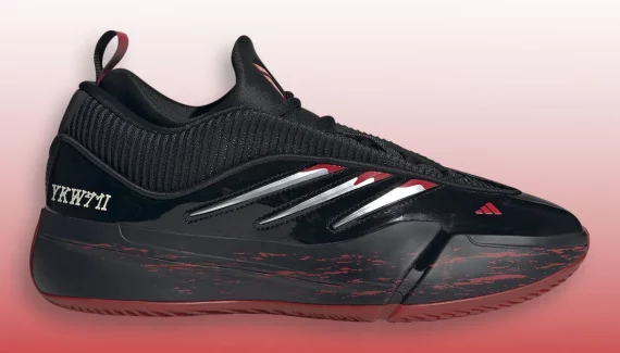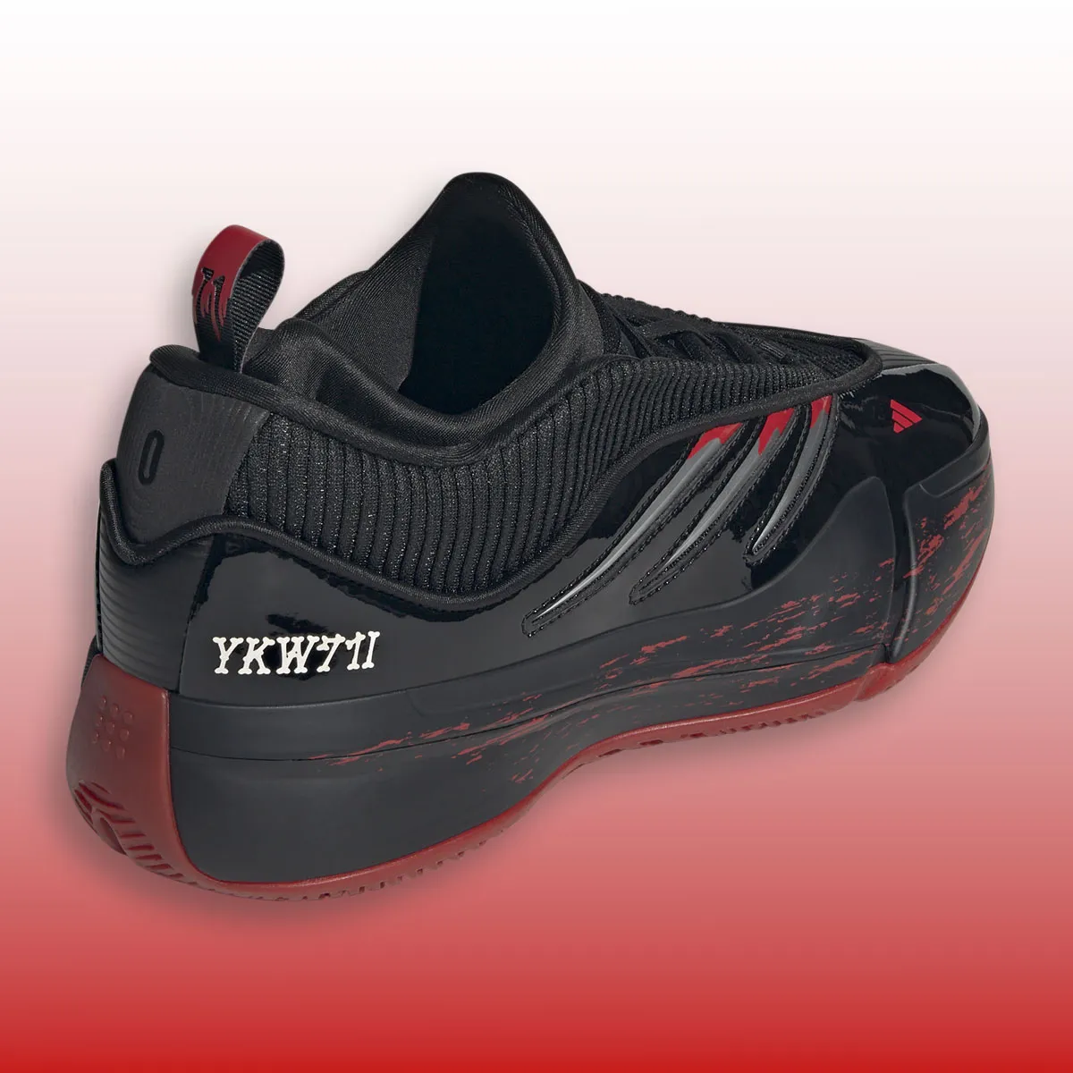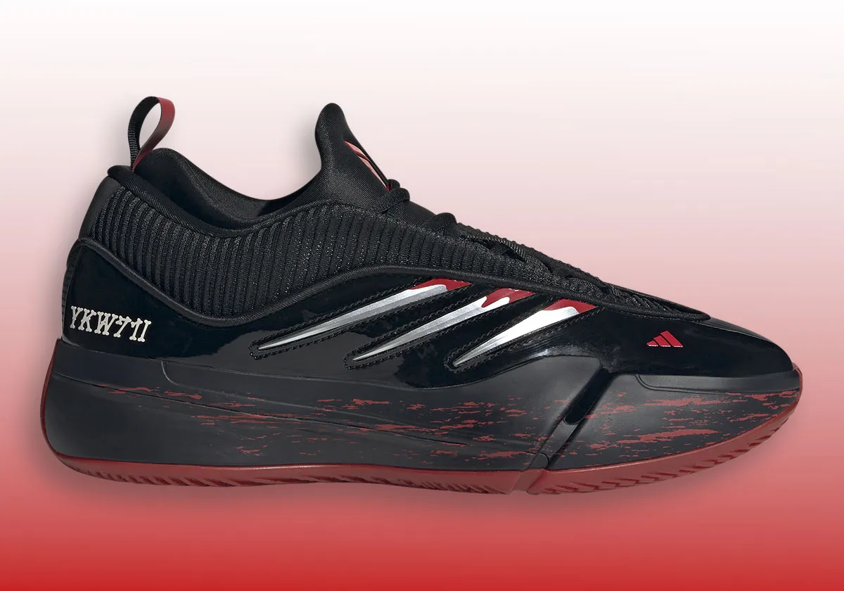 Cette nouvelle version de la neuvième chaussure signature de Damian Lillard se distingue en effet par sa tige ornée d’une base en cuir verni noir, complétée par une partie supérieure en mesh. Les trois bandes ressortant en gris sur l’empeigne sont dessinées en forme de lames et assorties d’un rouge sanglant. La semelle noire est également tachetée de rouge. On retrouve enfin le sigle « YKW71I » en blanc au niveau du talon, qui ferait notamment référence à son surnom “Dame Time” ainsi qu’à son match record à 71 points.