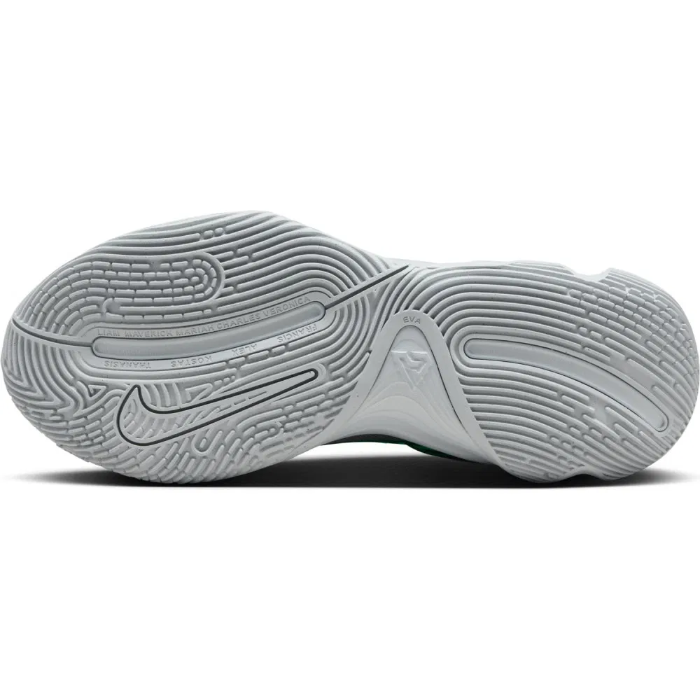 Pour ce troisième coloris, la chaussure est principalement grise, complétée par des finitions en vert, sur le « Swoosh », le logo du joueur sur la languette, et les lacets également.