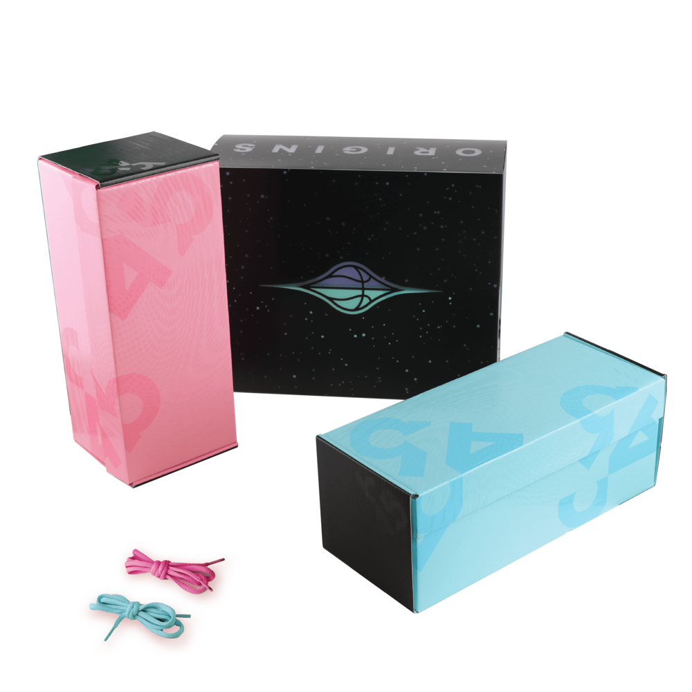 On peut d’abord évoquer le packaging de qualité avec un cadre aux motifs « galactiques » et une grande première : une boîte pour chaque chaussure, selon les coloris choisis.
