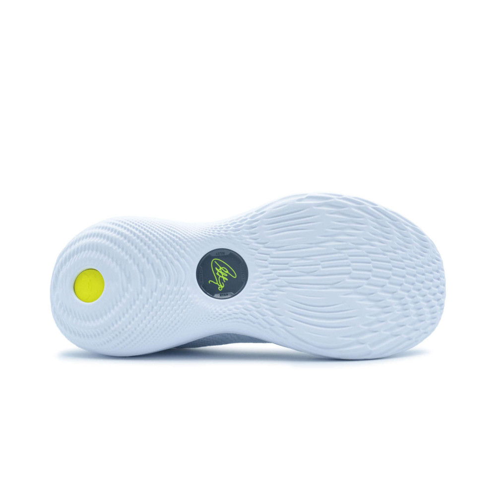 Le premier coloris mis en vente en France s’intitule “Gravity”, avec une tige principalement blanche comportant des finitions en jaune fluo et noir, au niveau du talon notamment, un mariage que l’on retrouve sur la semelle UA Flow, sur laquelle le logo du joueur ressort en jaune fluo, comme sur la languette.