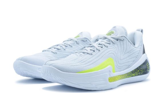 Le premier coloris mis en vente en France s’intitule “Gravity”, avec une tige principalement blanche comportant des finitions en jaune fluo et noir, au niveau du talon notamment, un mariage que l’on retrouve sur la semelle UA Flow, sur laquelle le logo du joueur ressort en jaune fluo, comme sur la languette.