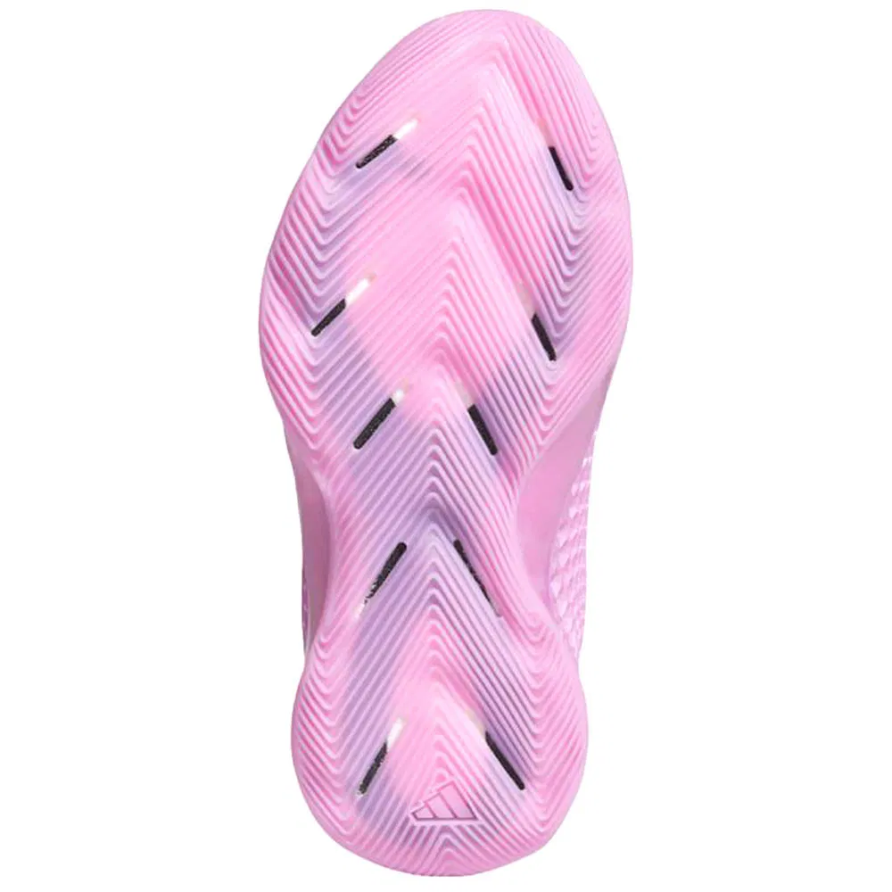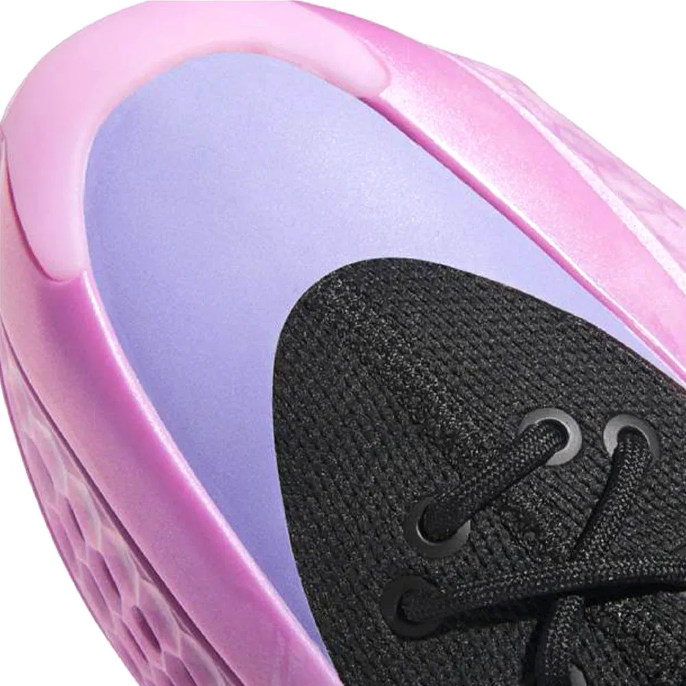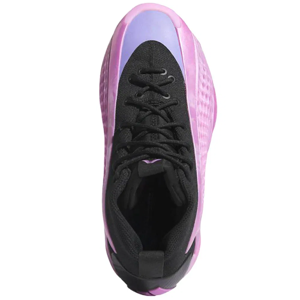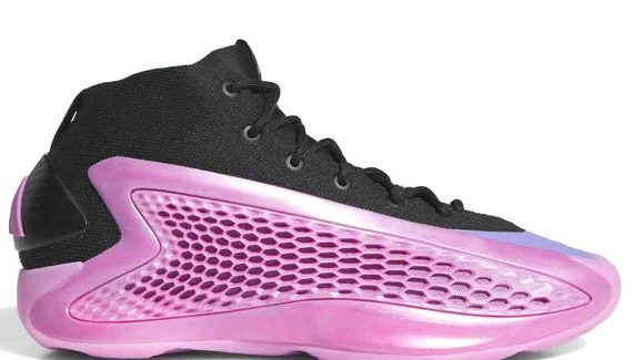 On retrouve aujourd’hui une AE 1 mid avec un nouveau coloris original, baptisé “Preloved Purple”. La base de la tige ainsi que la semelle apparaît dans un rose brillant, l’ensemble étant complété par une partie supérieure en mesh noir, et une zone en violet à l’avant du pied. Le logo du joueur sur la languette et de la marque adidas au niveau du talon ressortent également en violet.