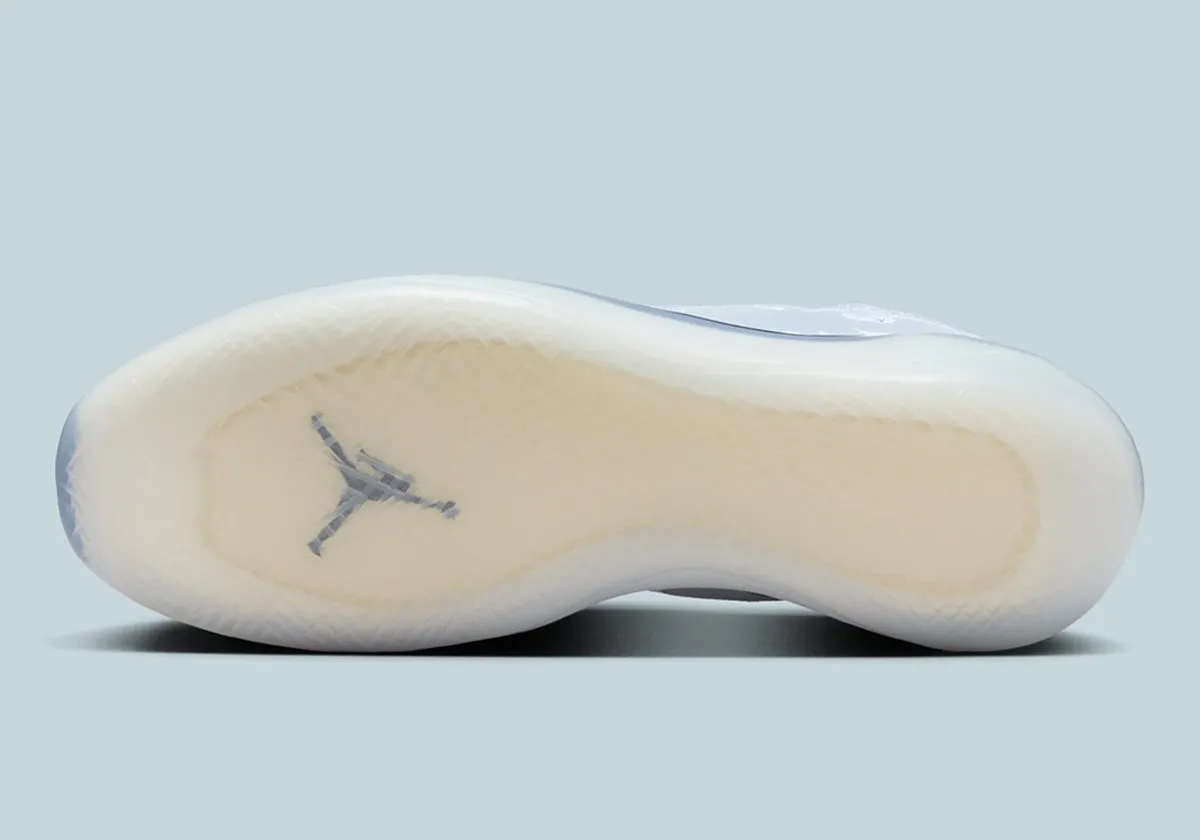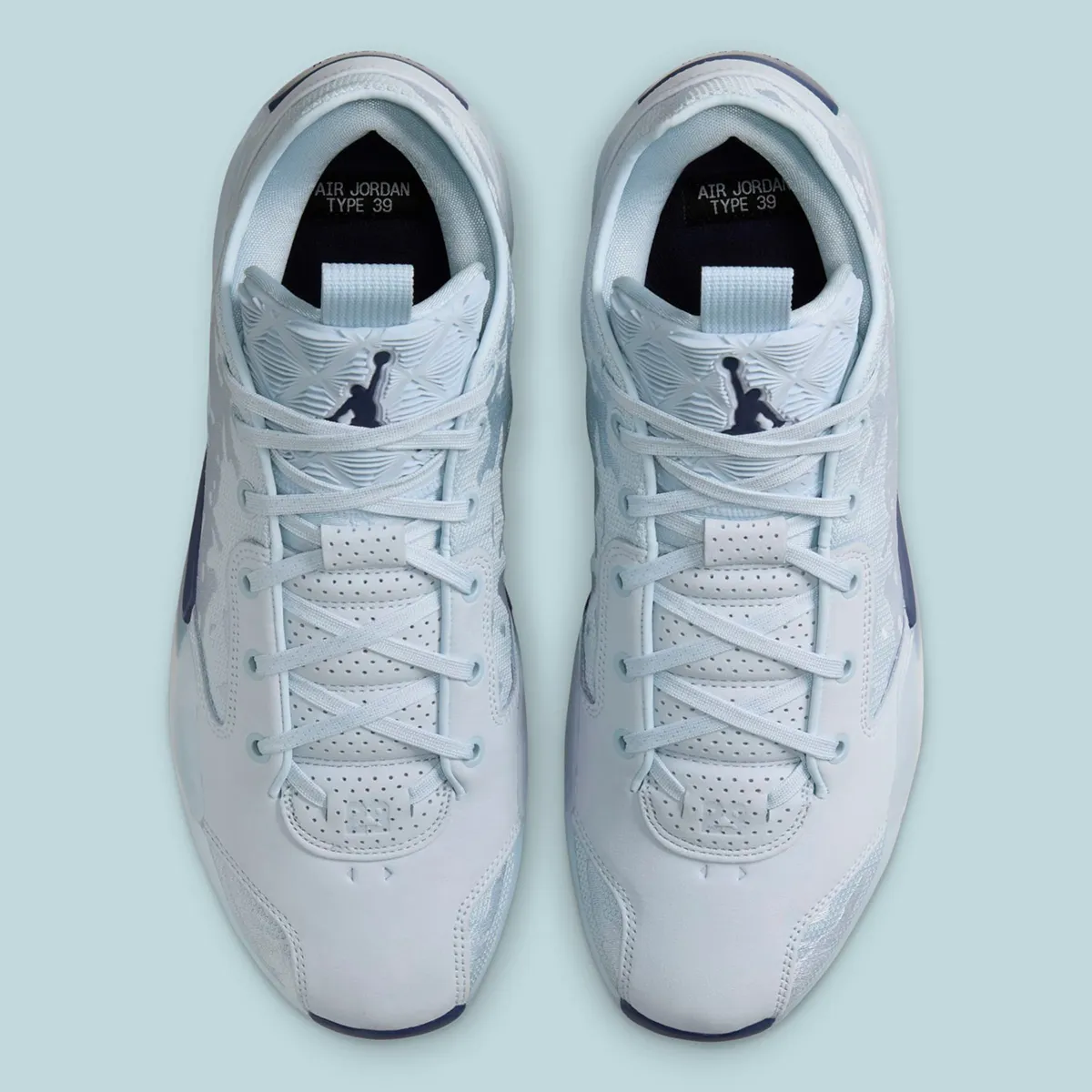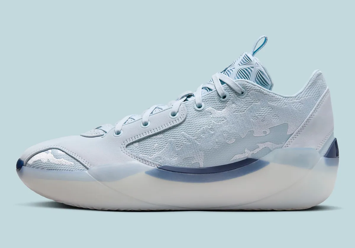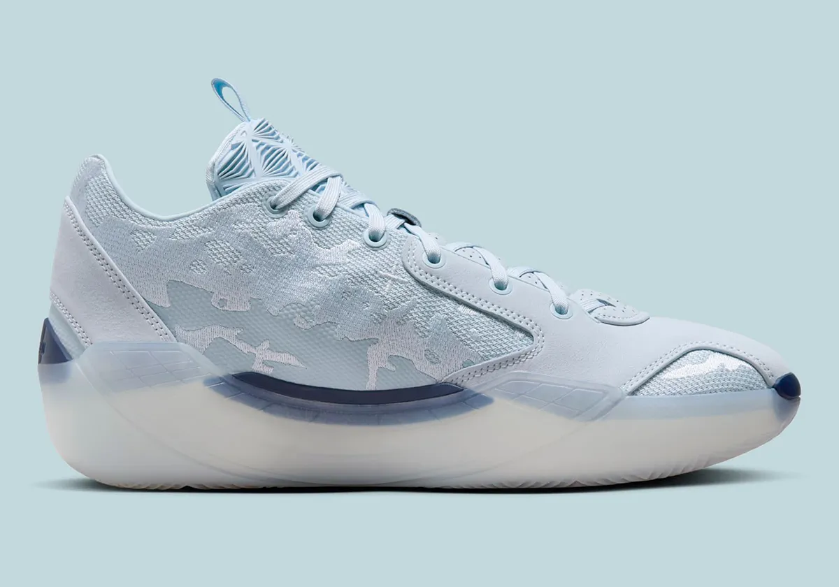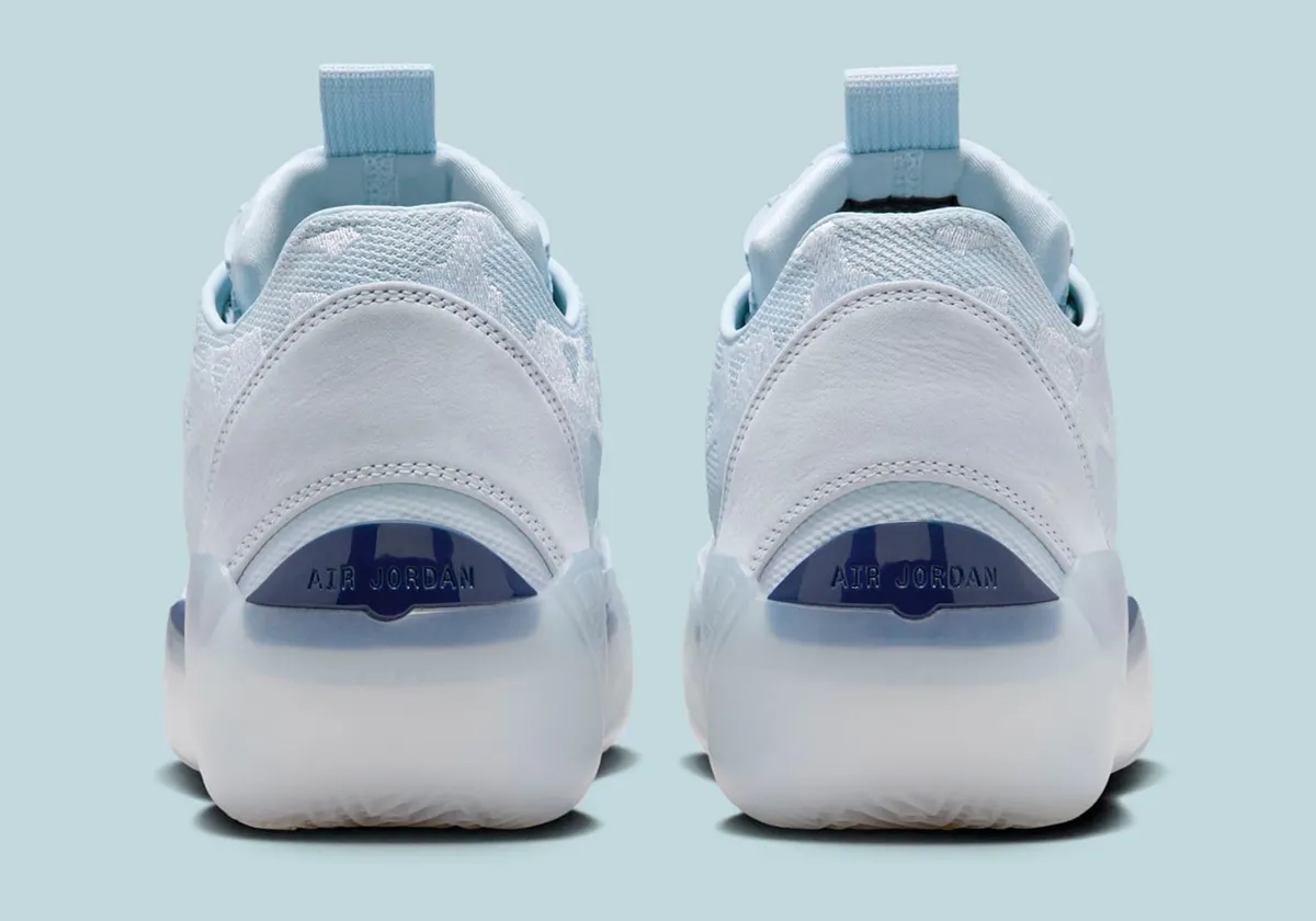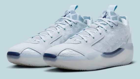 Baptisé « Half Blue », il semble avoir été inspiré des couleurs hivernales, avec notamment sa tige en bleu clair entre mesh et cuir, avec des motifs similaires à ceux présents sur la Zion 3 parcourant l’empeigne. Des touches de bleu marine apparaissent à l’avant du pied, à la base du talon ou encore sur la languette, pour faire ressortir le logo « Jumpman », tandis que la semelle s’affiche d’un blanc neigeux, entouré d’un revêtement extérieur translucide.