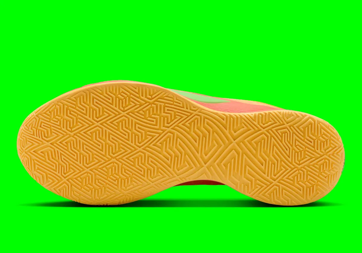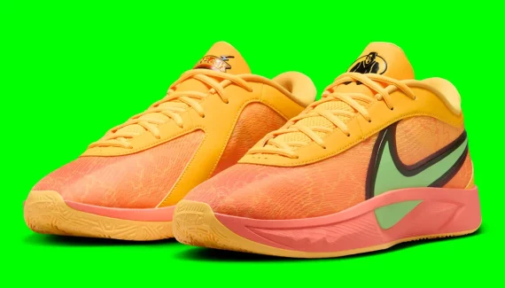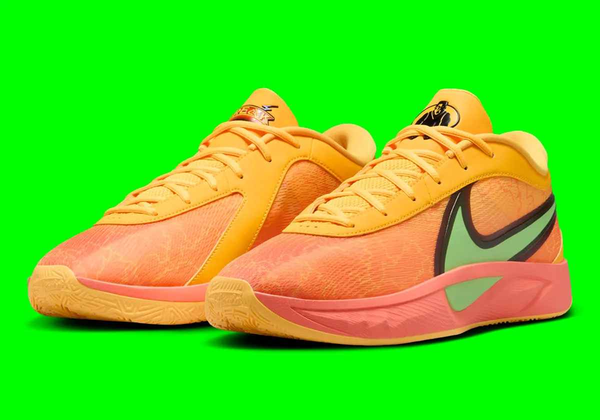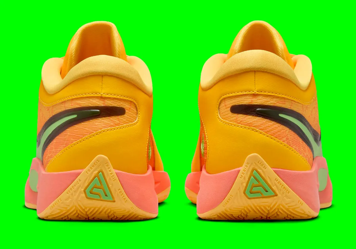 Niveau couleurs, la tige alterne entre deux teintes d’orange et du rose, avec un “Swoosh” traversant l’empeigne en vert et avec des contours en noir. Composée d’une mousse Cushlon 2.0 et d’une unité Air Zoom à l’avant du pied, la semelle intermédiaire est quant à elle en rose, reposant sur une semelle extérieure “Freakprint” également orange. Le logo “historique” de Giannis Antetokounmpo apparaît en vert à la base du talon.