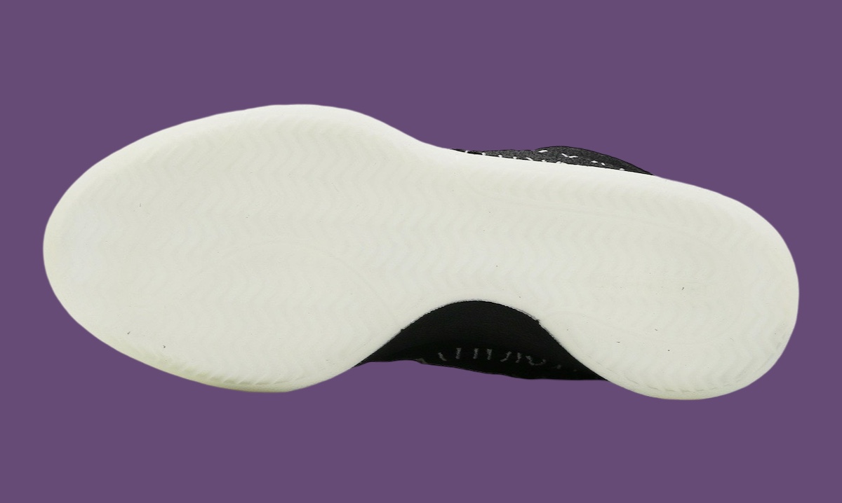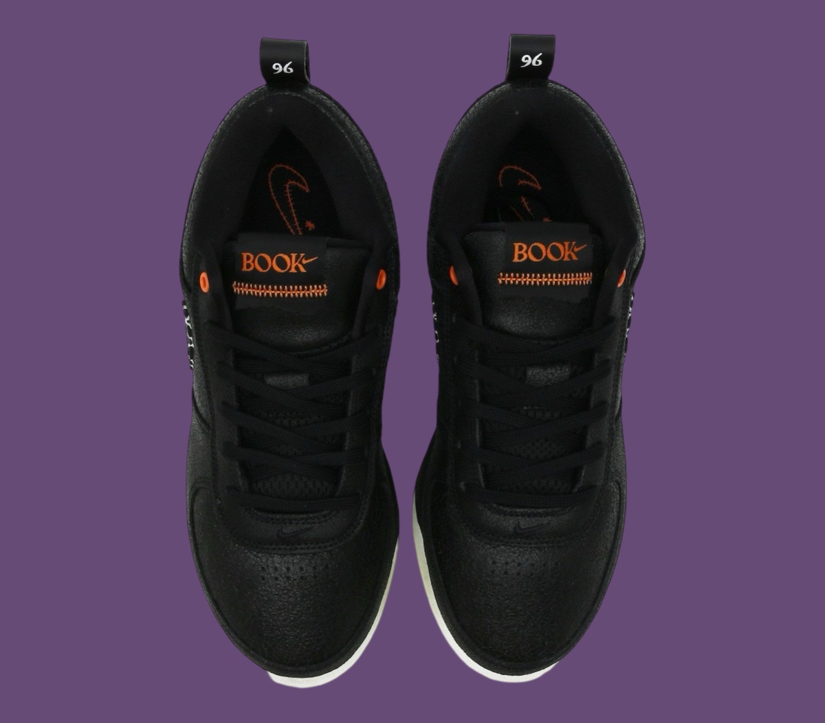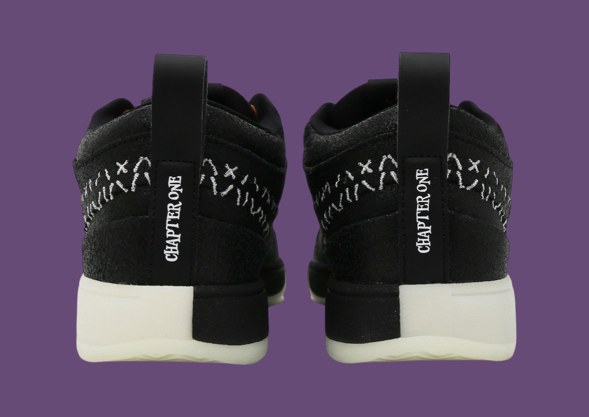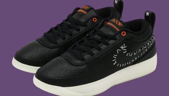 La tige en noir oscille entre cuir et nubuck, avec sur l’empeigne un « Swoosh » dont les contours apparaissent en blanc dans un style similaire à une ensemble de points de suture. On retrouve le même esprit de « cicatrice » en orange sur la languette pour accompagner le logo « Book », également en orange. L’inscription « Chapter One » présente en vertical sur le talon apparaît avec une police toute particulière pour l’occasion. L’ensemble repose sur une semelle en noir et blanc.