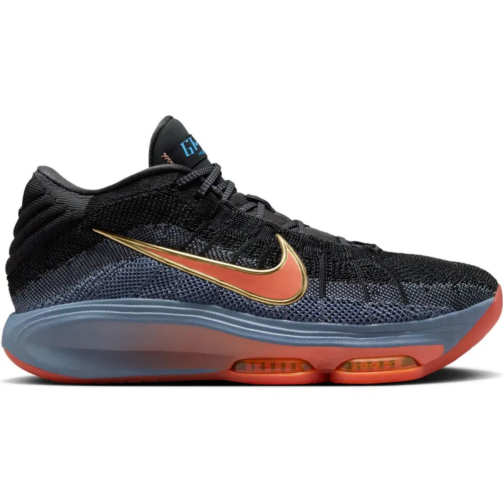 Côté design, Nike est revenu à du classique après avoir osé davantage sur la GT Hustle 2. La tige en mesh, ici en noir et gris bleu, est assortie d’un « Swoosh » en orange, tandis que la semelle extérieure ressort en orange et bleu-gris. Les inscriptions GT Hustle 3 et GT apportent le contraste d’un bleu plus clair.