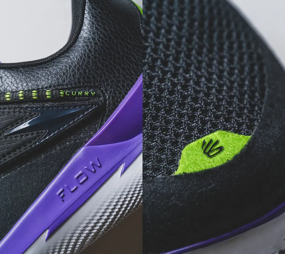 Au niveau design de la tige, ressortant ici entre noir, violet et vert fluo « Volt », on peut voir qu’une sangle va parcourir le milieu du pied et recouvrir les lacets. Son embout argenté illustre également la queue d’un renard. La tige sera quant à elle entre mesh et cuir. Le nom de Stephen Curry et le logo « Curry Brand » figureront aussi sur la chaussure qui repose sur une semelle « Flow » sur toute la longueur.