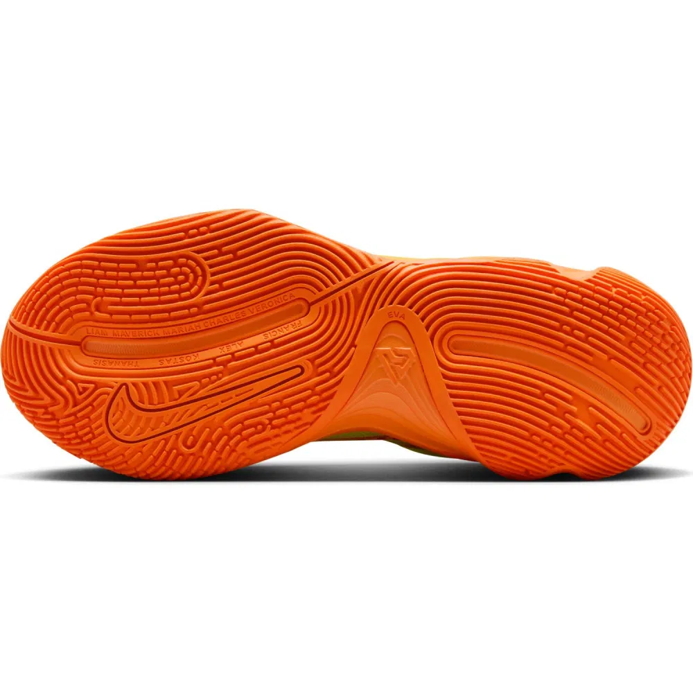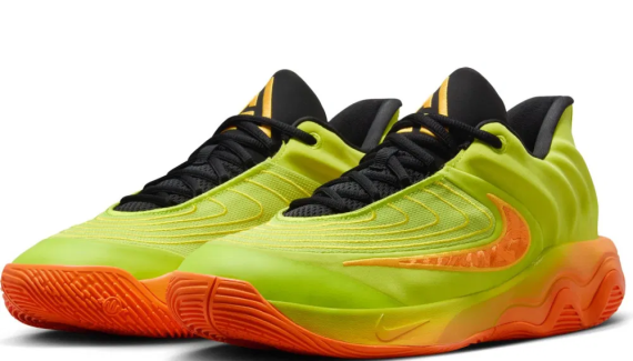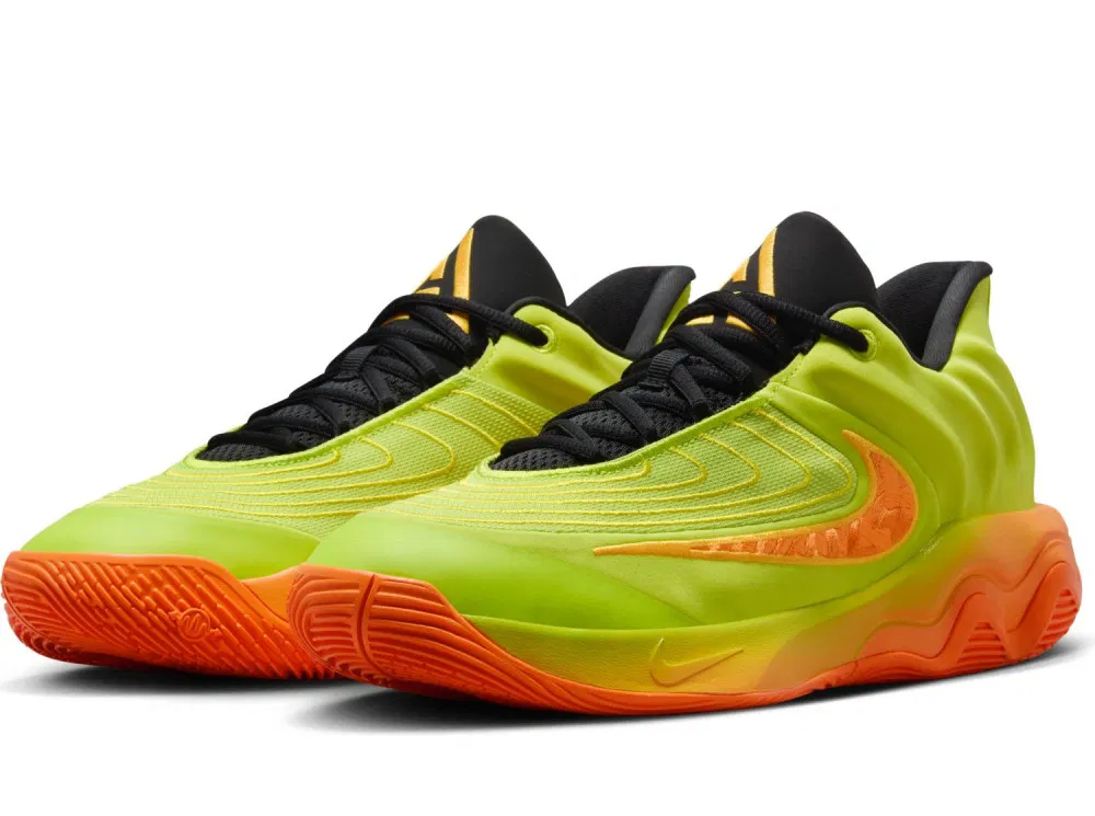 Le modèle signature « alternatif » de Giannis Antetokounmpo en est à son quatrième coloris disponible en France avec cette fois une tige principalement en vert fluo. L’ensemble est complété d’un « Swoosh » orange, un col et une languette en noir sur laquelle le logo du joueur ressort en orange. La semelle oscille également entre vert fluo et orange.