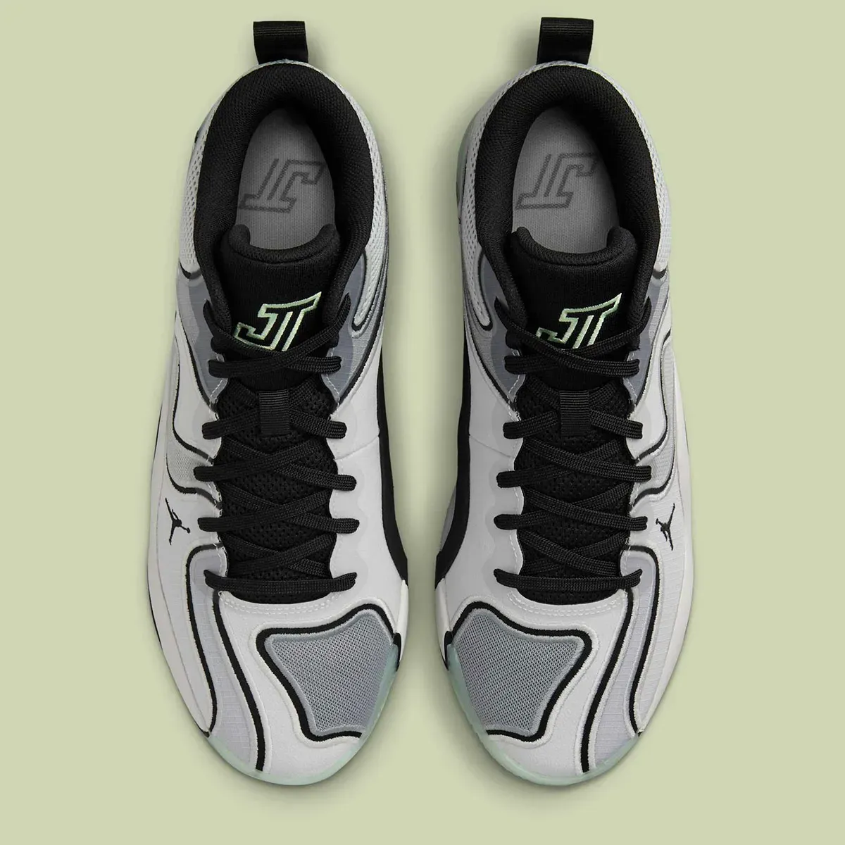 JT enchaîne donc les grosses performances avec sa nouvelle chaussure signature aux pieds, la Jordan Tatum 3, qui vient d'être déclinée sous un nouveau coloris en France, après les versions « Zero Days Off » et « Welcome To The Garden ». Baptisé « Zen », celle-ci se présente avec une tige entre gris et blanc assortie de contours en noir. La languette, où ressort le logo JT en vert fluo, et le col apparaissent également en noir.
