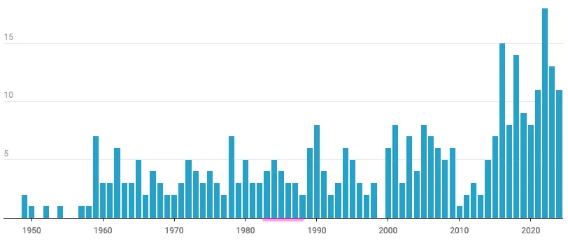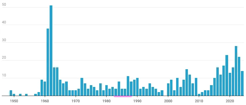 De quoi expliquer que c'est durant l'année 1962 que le plus de matchs à 50 points ont été recensés en saison régulière (51), devant l'année 1961 (38) puis l'année 2022 (28).