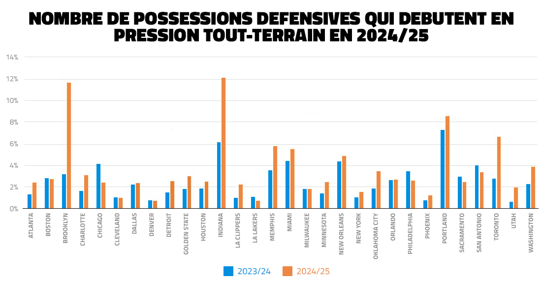 Entre 2008, soit le début de l’analyse des matchs par Synergy Sports, et 2023, une seule équipe avait ainsi débuté plus de 5% de ses possessions défensives en pression tout-terrain et il s’agissait des Hornets de 2020/21. Sauf que l’an passé, les Pacers et les Blazers avaient dépassé ce seuil, Portland montant jusqu’à 7.2% !