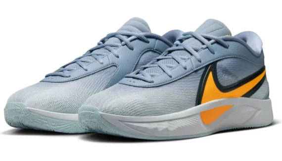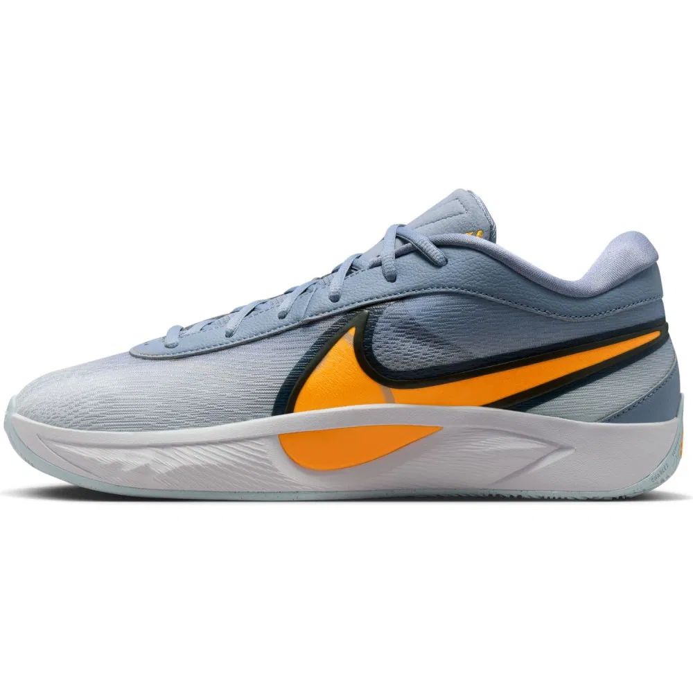 On retrouve une tige composée de différentes teintes de gris, allant du gris-clair au gris-bleu. L’empeigne fait ressortir un gros “Swoosh” en orange vif et aux contours en noir. L’ensemble repose sur une semelle en blanc au niveau extérieur et gris sur la partie extérieure. Le logo du joueur ressort également en orange à la base du talon.