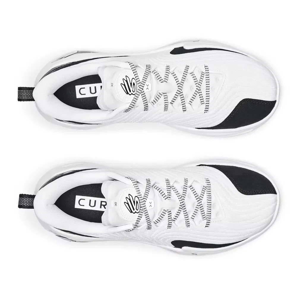 Ce dernier se présente avec une tige blanche assortie de finitions en noir, notamment au niveau du renfort en TPU moulé en 3D sur talon, sur la partie intérieure de l’avant du pied, ou pour faire ressortir le logo du meneur des Warriors sur la languette. Sa signature, est quant à elle présente sous le milieu de la semelle, en blanc sur fond noir