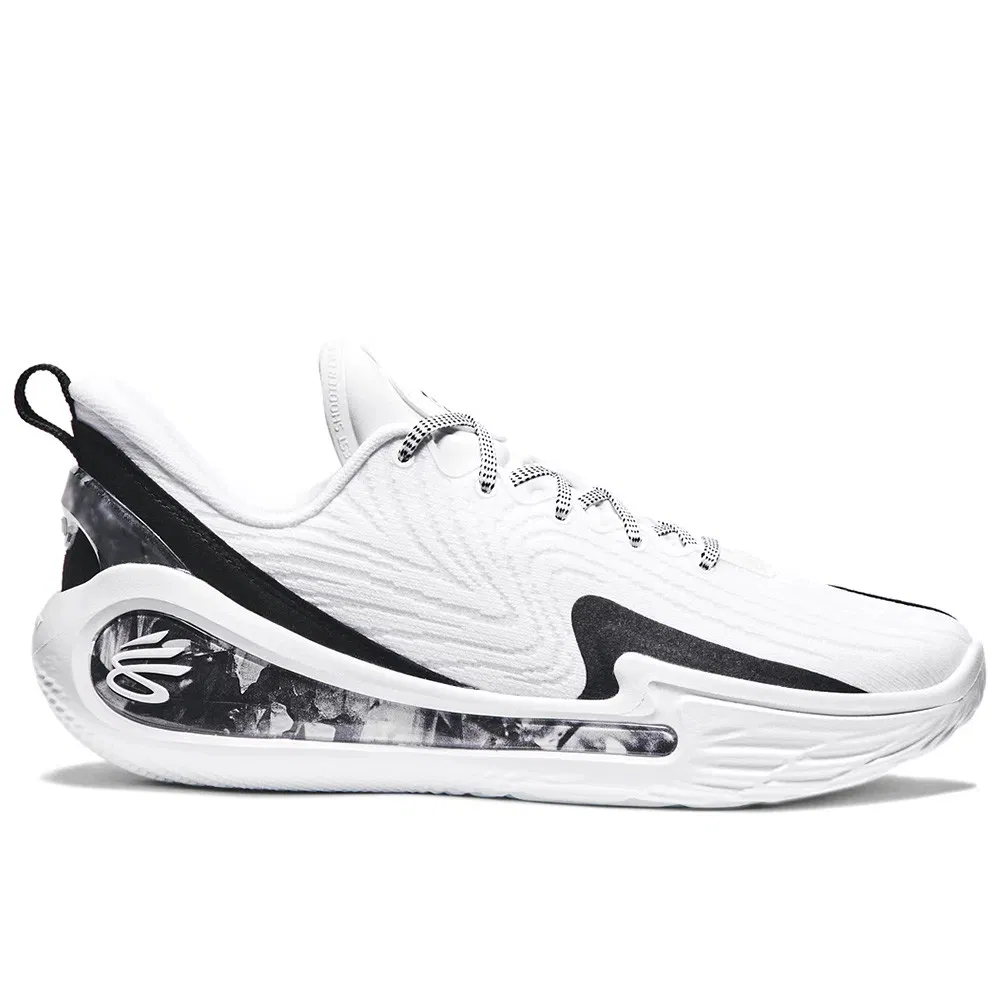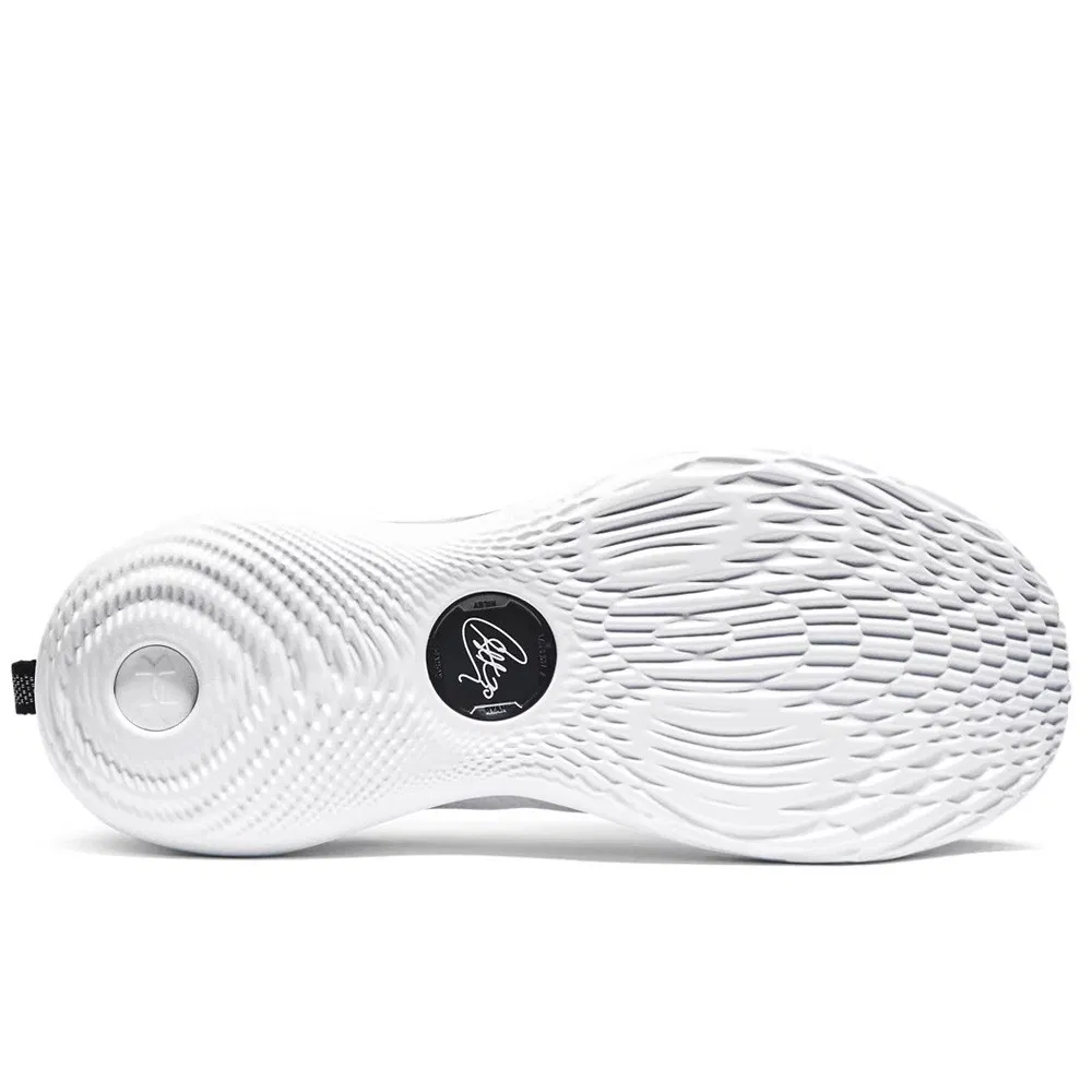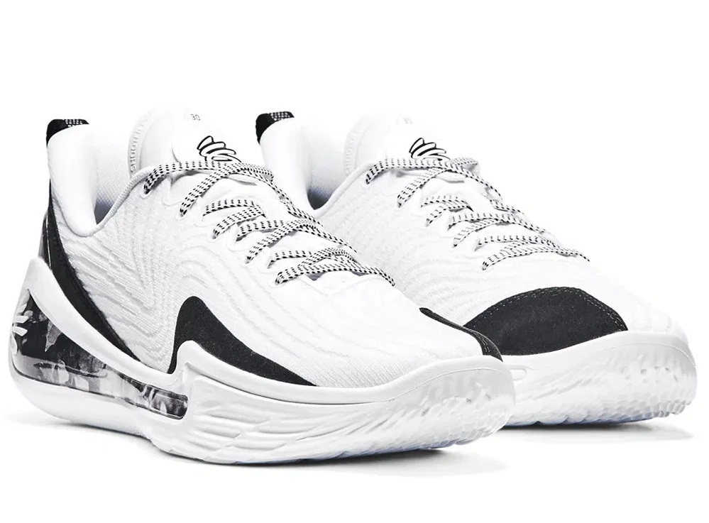 Ce dernier se présente avec une tige blanche assortie de finitions en noir, notamment au niveau du renfort en TPU moulé en 3D sur talon, sur la partie intérieure de l’avant du pied, ou pour faire ressortir le logo du meneur des Warriors sur la languette. Sa signature, est quant à elle présente sous le milieu de la semelle, en blanc sur fond noir
