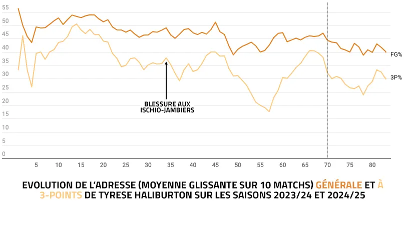 L'an passé, Tyrese Haliburton enflammait le début de la saison NBA avec son adresse à 3-points et ses passes aveugles. Et s'il avait connu un gros coup de moins bien à partir de sa blessure aux ischio-jambiers, le meneur et son équipe avaient tout de même atteint la finale de conférence…